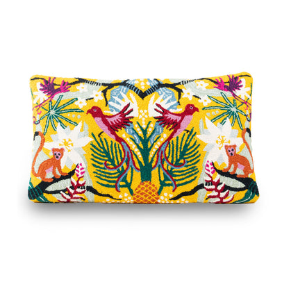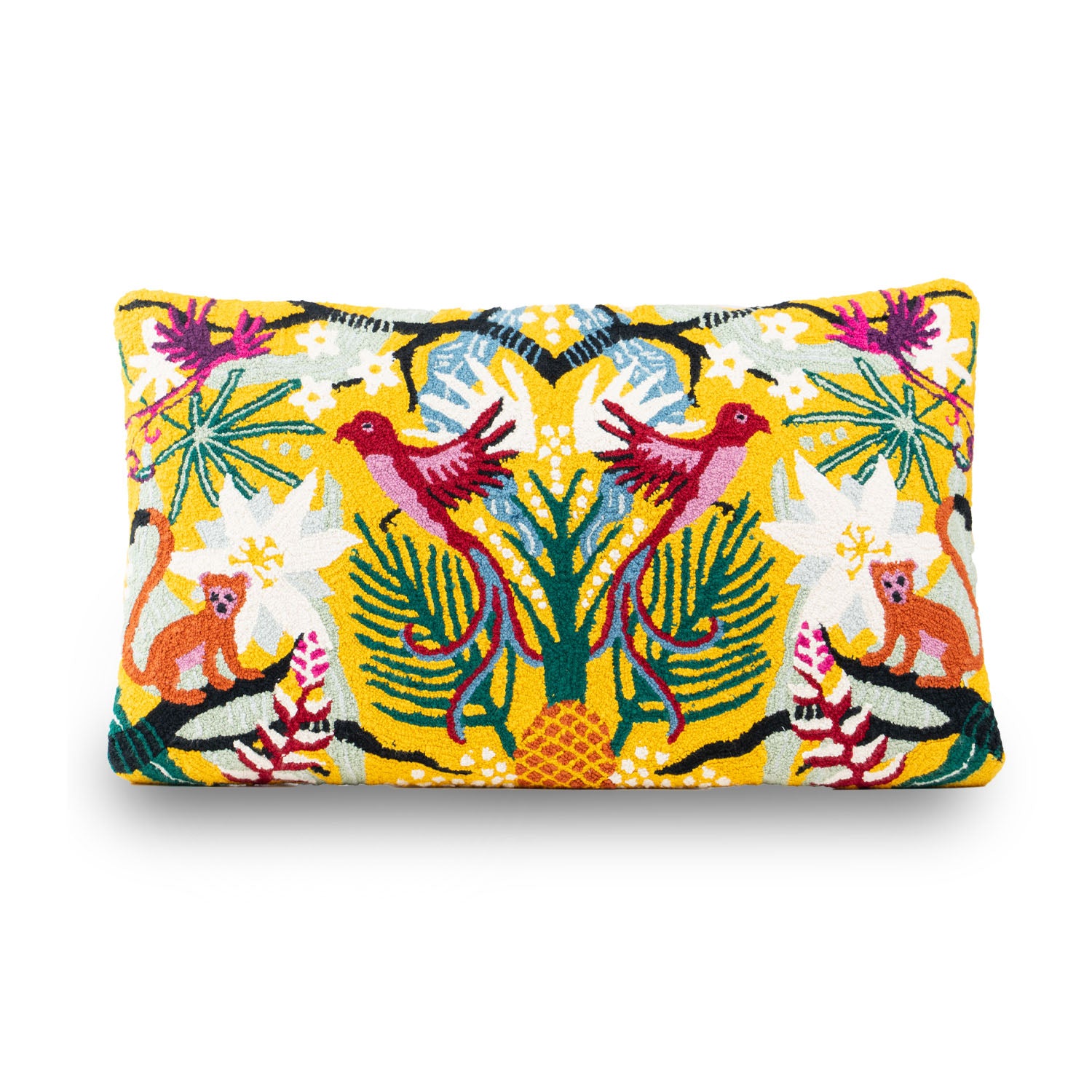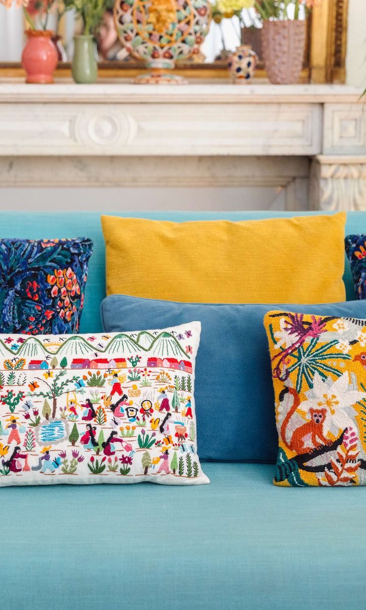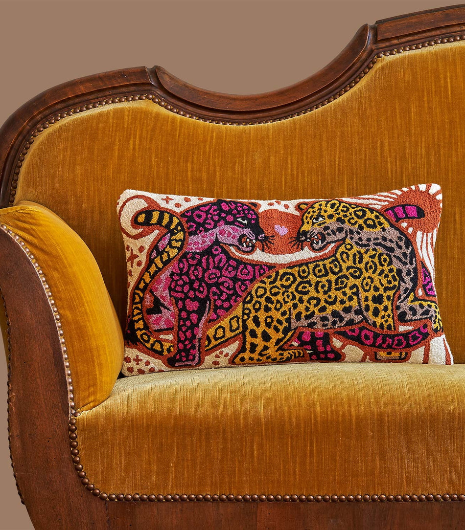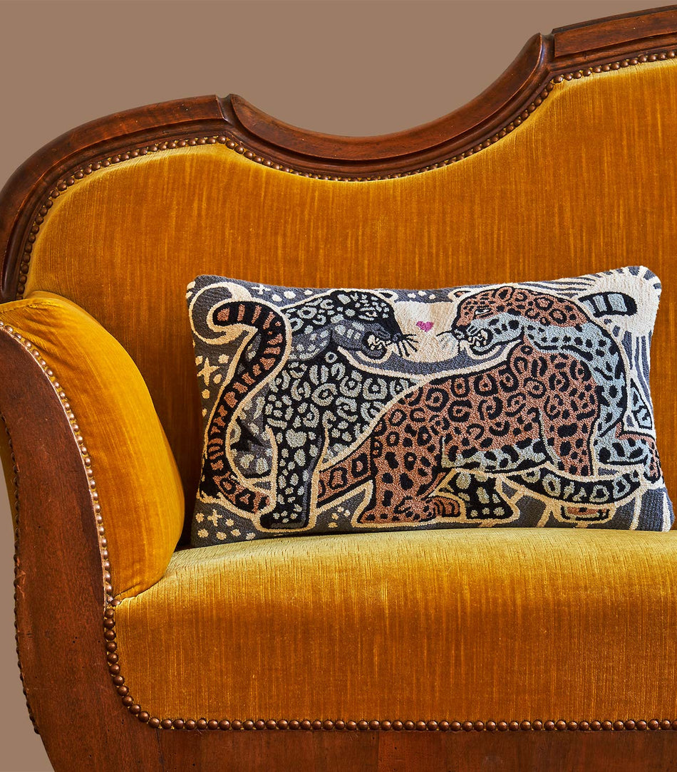 Ce coussin brodé à la main célèbre la force et l’intensité des félins dans une explosion de couleurs éclatantes. Réalisé par les femmes indigènes de Colombie et du Venezuela en partenariat avec l’association suisse Mama Tierra, il incarne un savoir-faire ancestral et un engagement éthique fort.