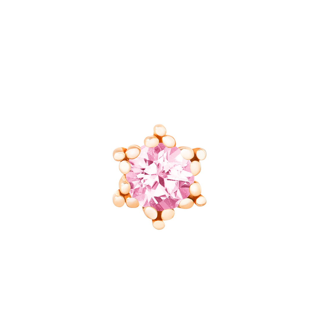 At the center is a 0.13-carat traceable pink spinel. The recycled gold setting weighs 0.47 grams. The earring is finished with butterfly backs, and the post is engraved with Rosa Maïtea.