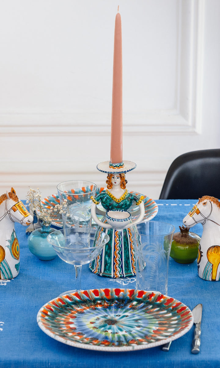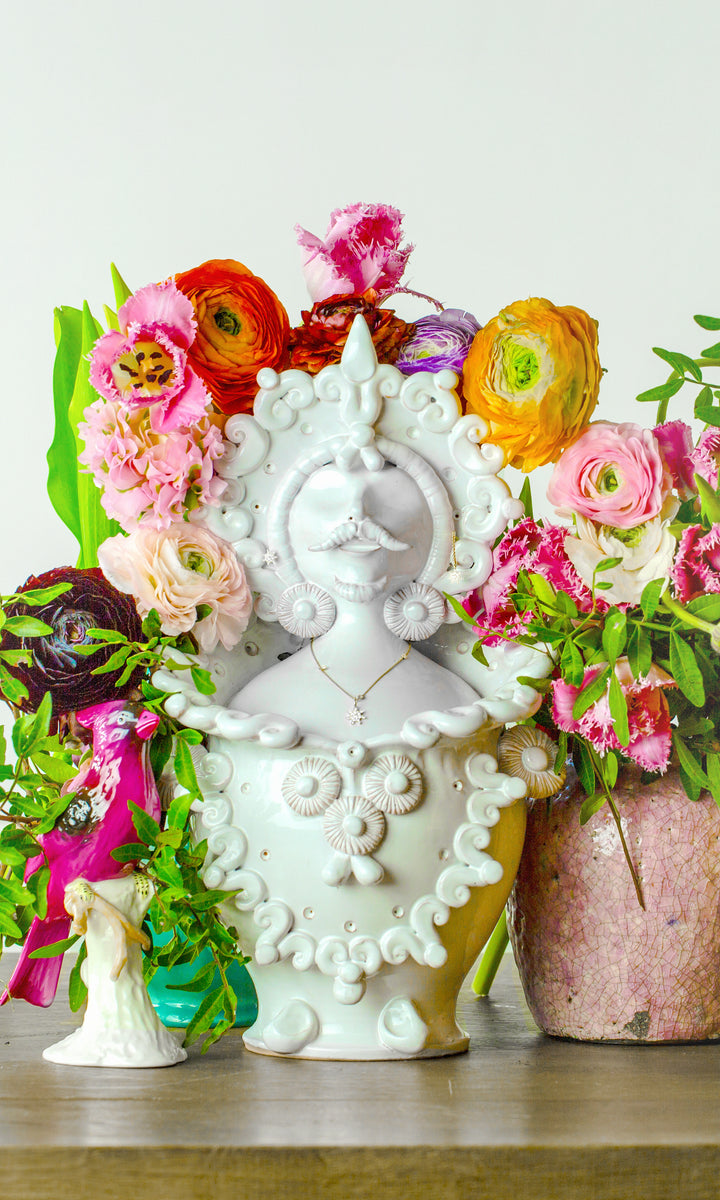 Directement venue de Caltagirone, capitale historique de la céramique en Sicile, cette Pupa con i baffi – littéralement "femme à moustache" – détourne avec humour les représentations classiques de la féminité.