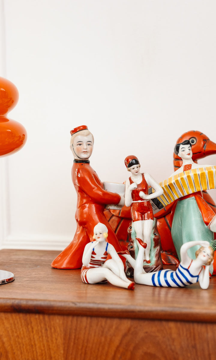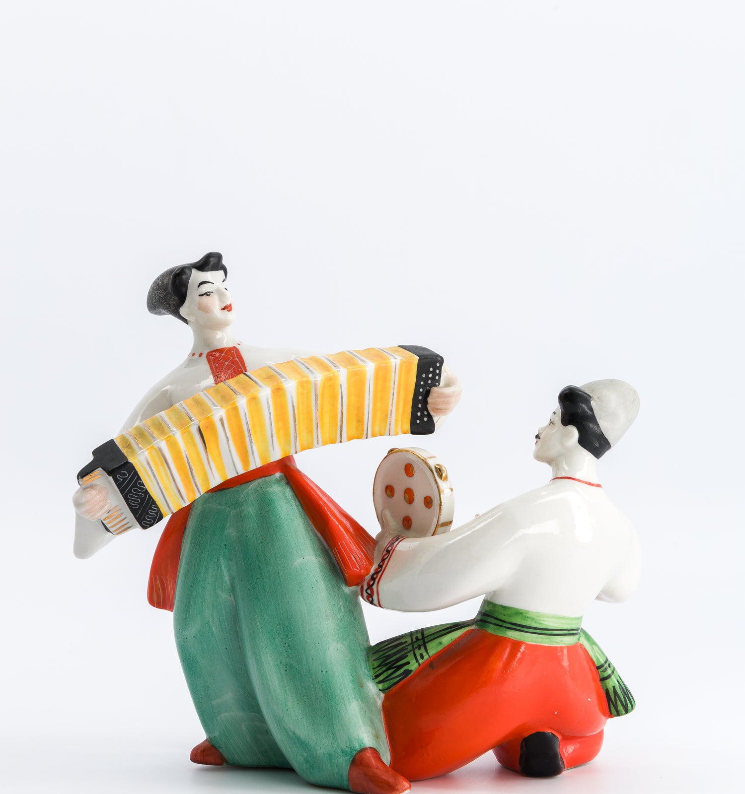 Cette pièce unique en porcelaine est une véritable célébration de la musique et du mouvement. Inspirée par l'esthétique joyeuse et stylisée de l’Art Déco, elle représente un duo de musiciens en pleine performance : l’un joue de l’accordéon, l’autre du tambourin. L’ensemble est riche en détails, des expressions animées aux costumes traditionnels colorés.