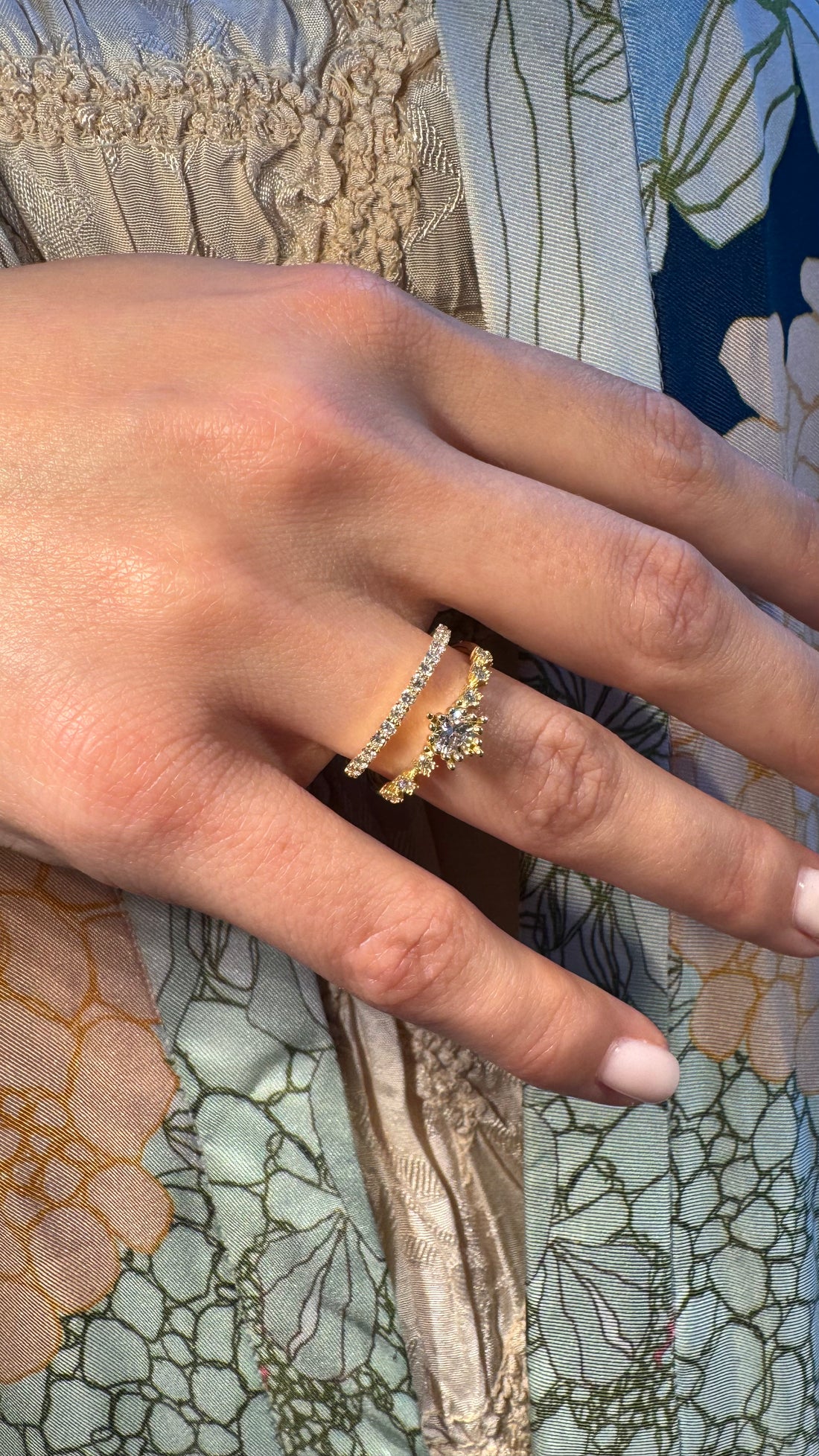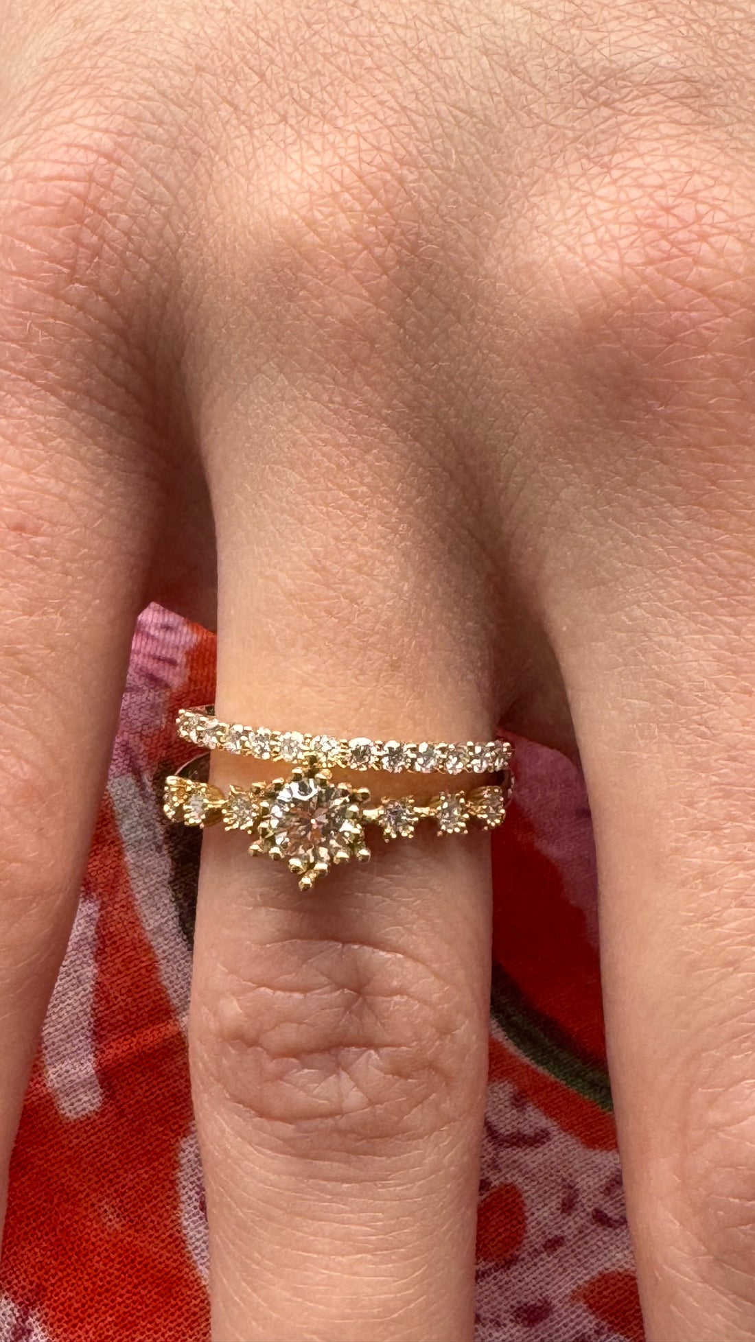 Resaltando la belleza de los diamantes con un engaste único, adornado con tres cuentas de oro reciclado montadas en forma de estrella, Rosa Maitea crea un anillo original. Esta ambientación, firma de Rosa Maïtea, recuerda el simbolismo mágico del número 3 como unión de perfección, equilibrio y amor infinito.
