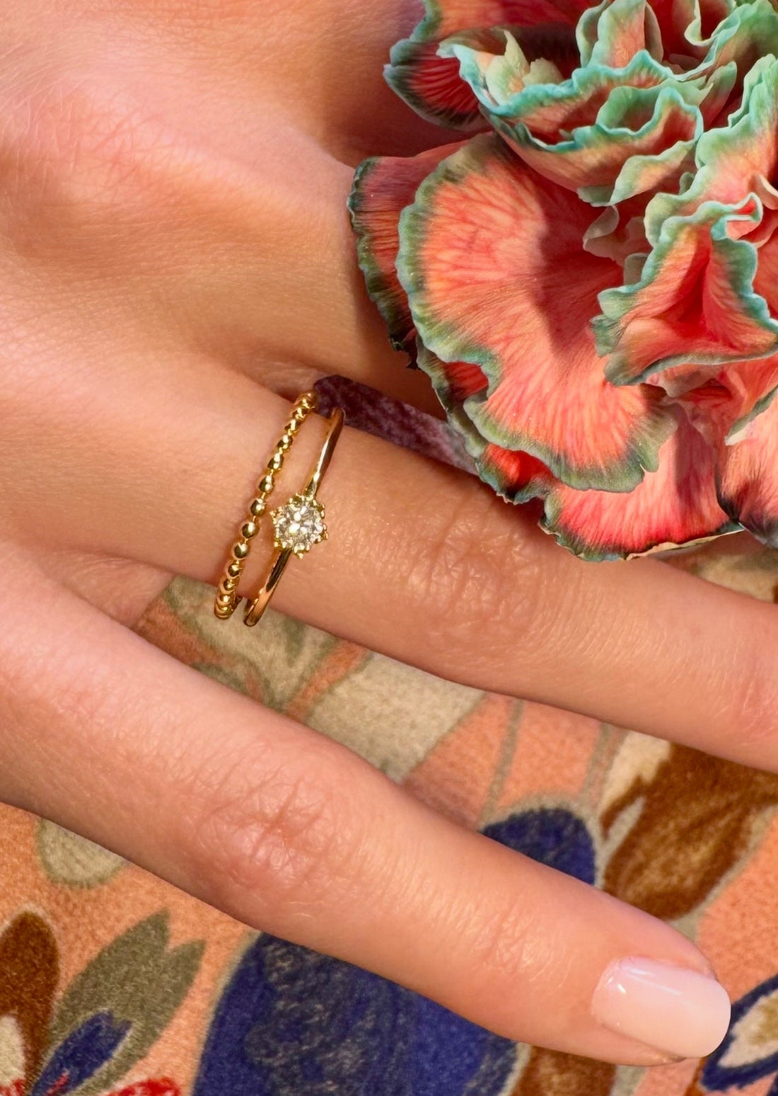 Resaltando la belleza de los diamantes con un engaste único, adornado con tres cuentas de oro reciclado montadas en forma de estrella, Rosa Maitea crea un anillo original. Esta ambientación, firma de Rosa Maïtea, recuerda el simbolismo mágico del número 3 como unión de perfección, equilibrio y amor infinito.