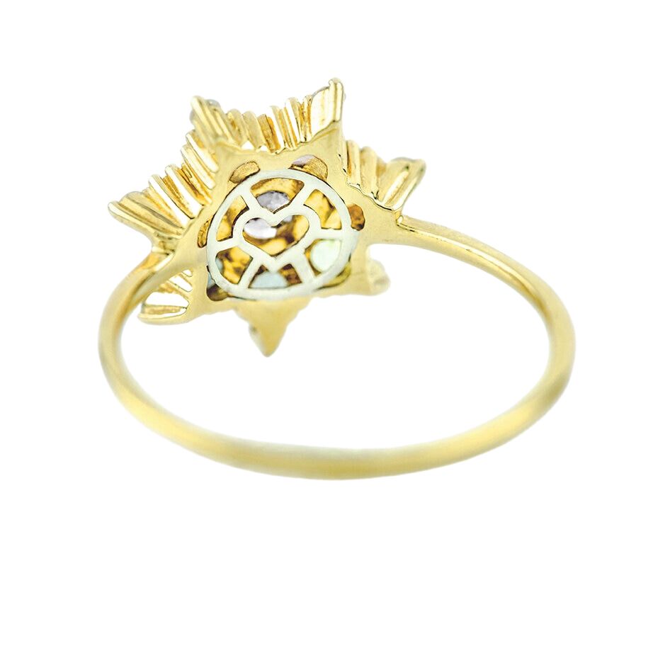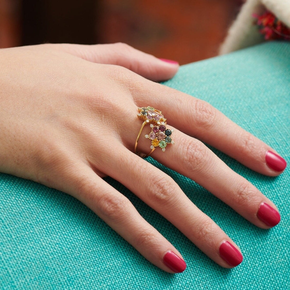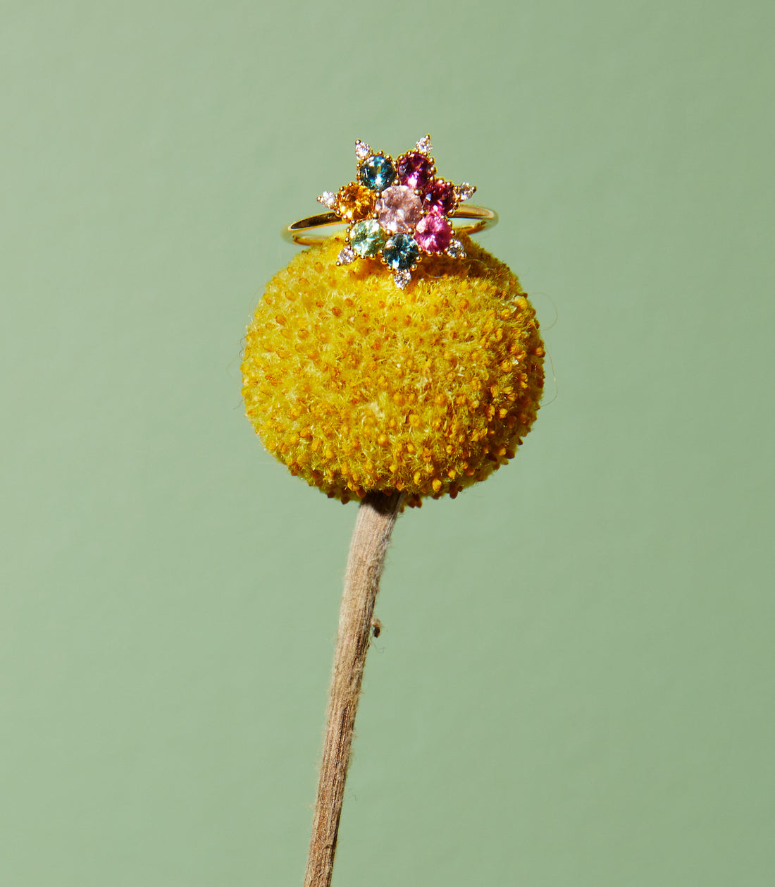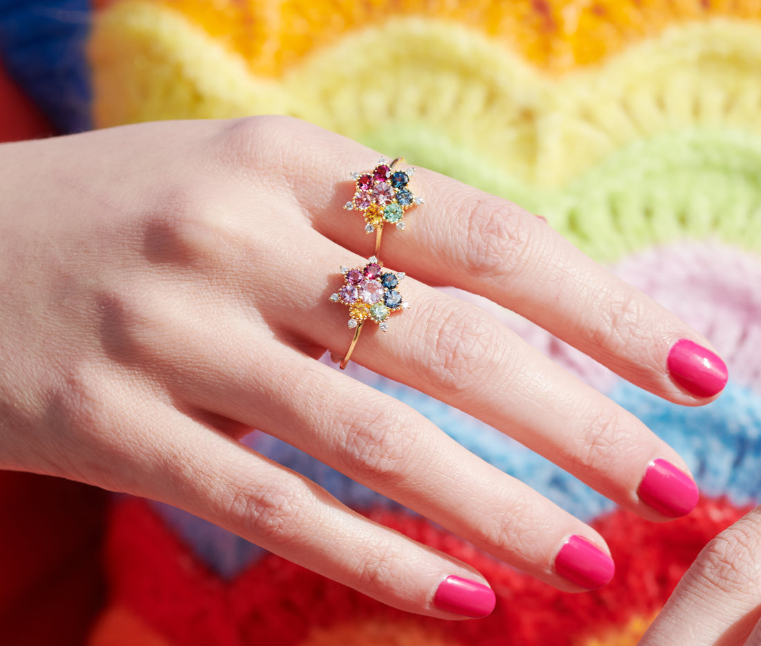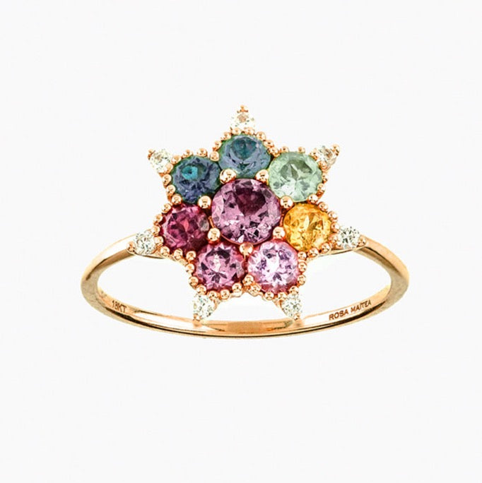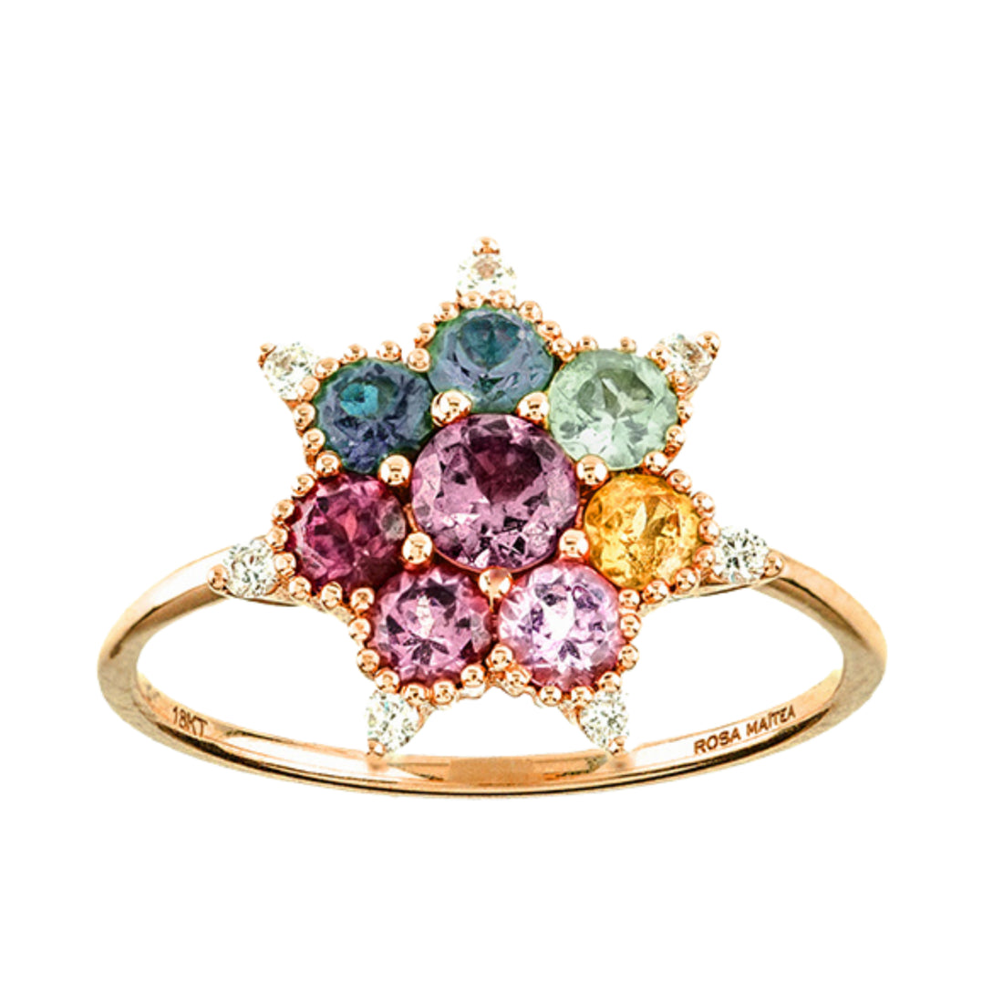 El anillo ético Arcoiris es la versión arcoíris del anillo Bonne Étoile de Rosa Maïtea. Una variación policromada y creativa del tema de las estrellas, el anillo está hecho de oro reciclado y diamantes y engastado con piedras finas 100 % rastreables de Tanzania en magníficos colores brillantes.