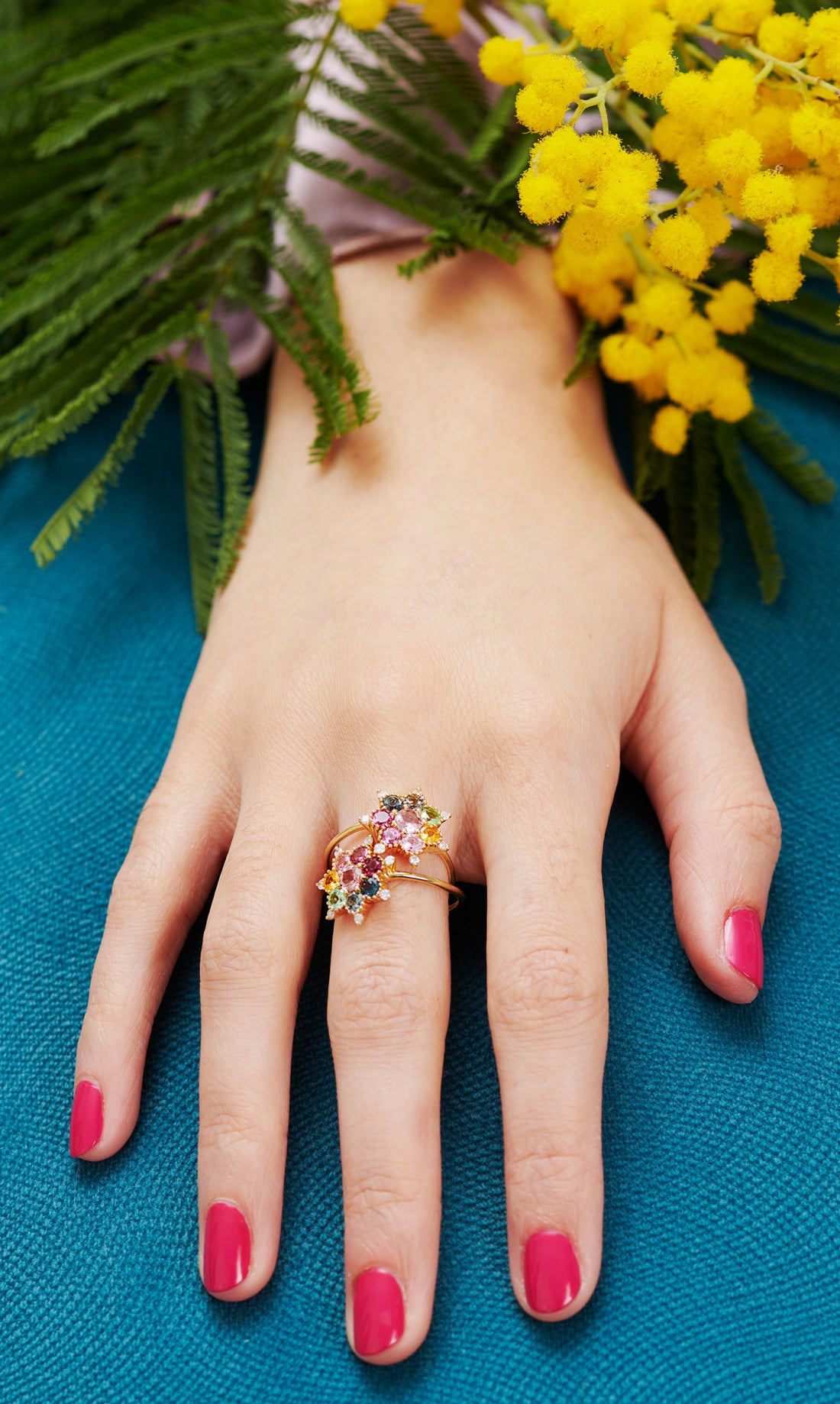 El anillo está fabricado en oro reciclado de 18 quilates y pesa 3,19 gramos. La montura está compuesta por diamantes reciclados de 0,10 quilates y 8 espinelas y granates en champagne, menta, rodolita rosa y roja, rosa bebé, espesartita gris y azul celeste de 1.420 quilates.
