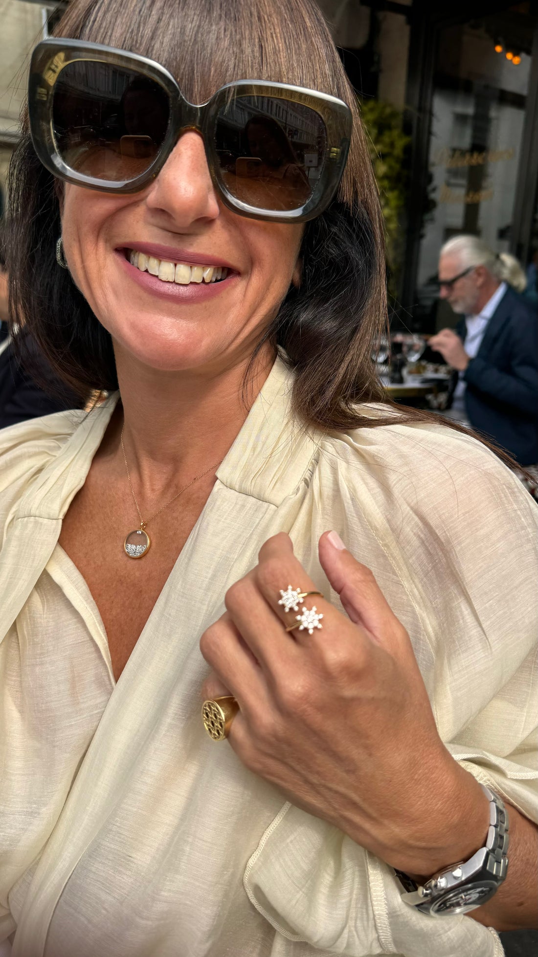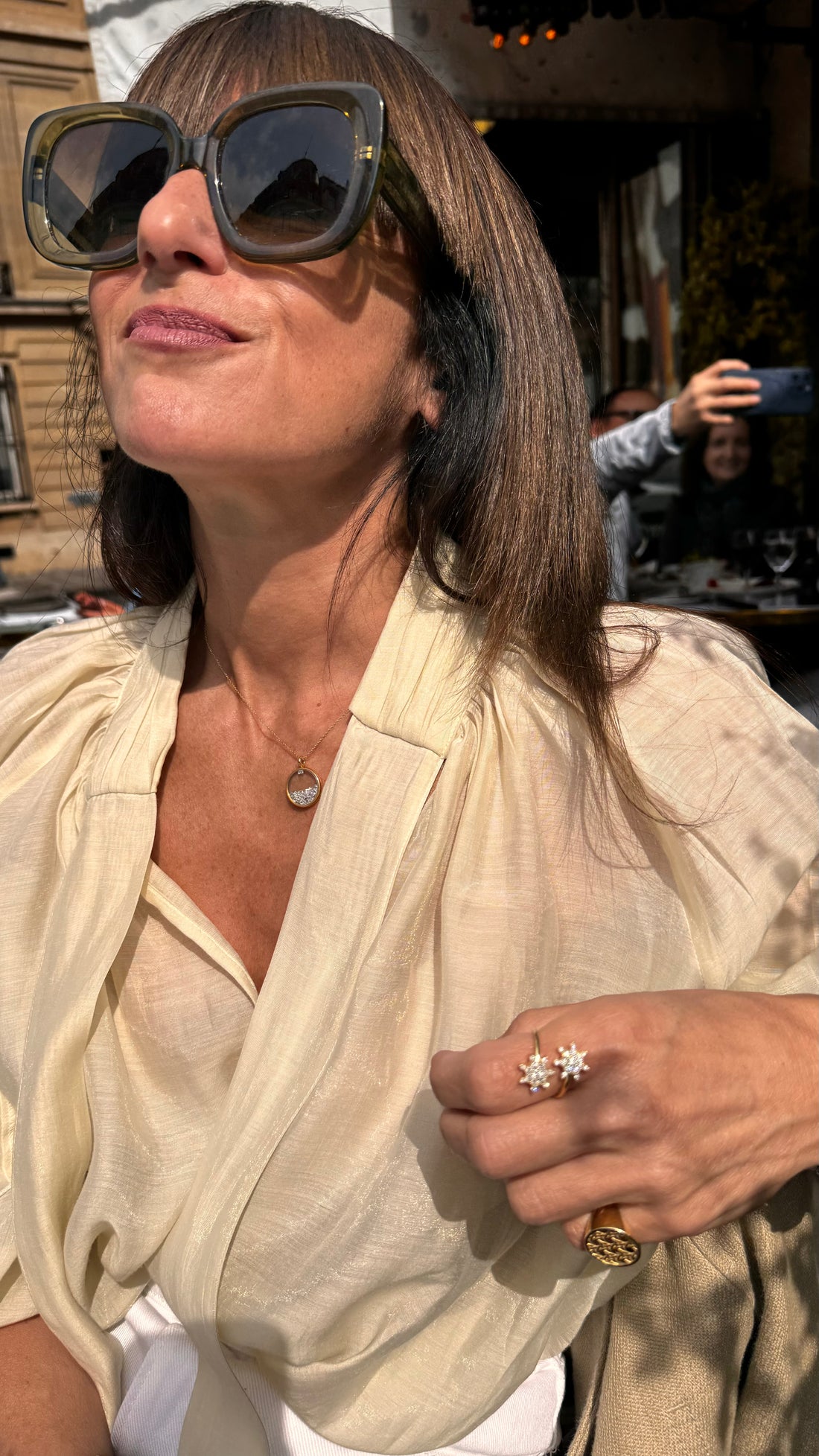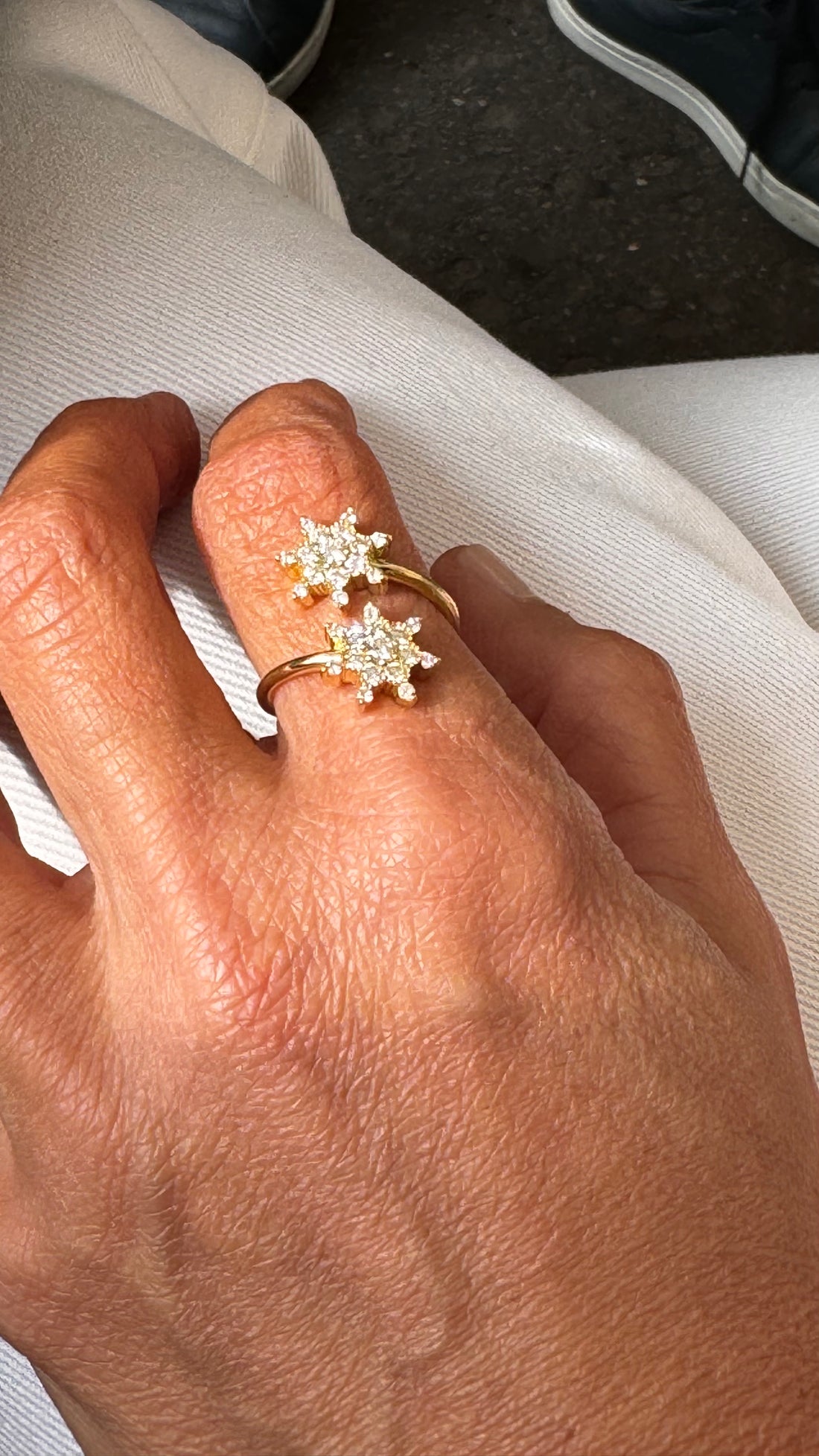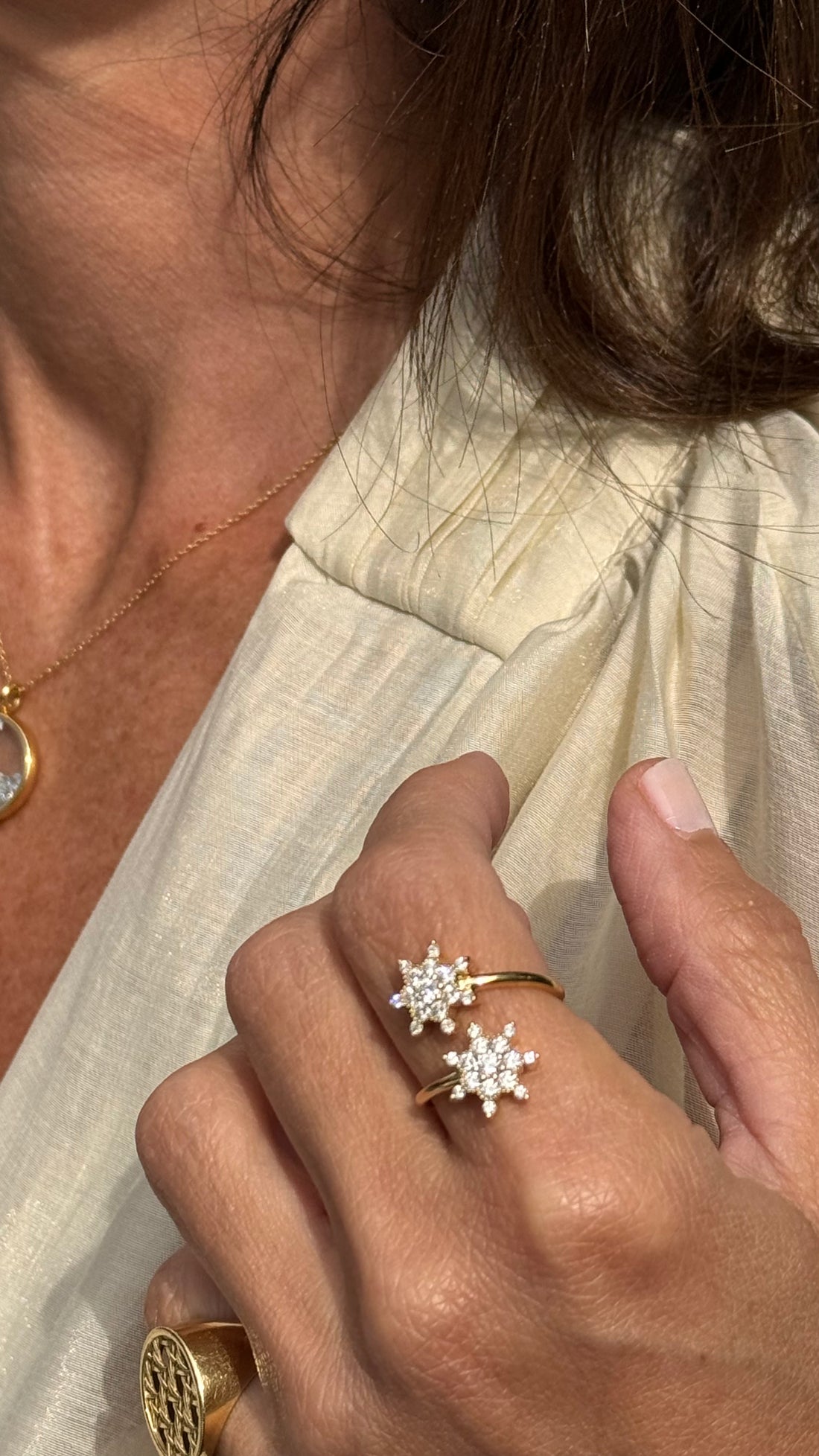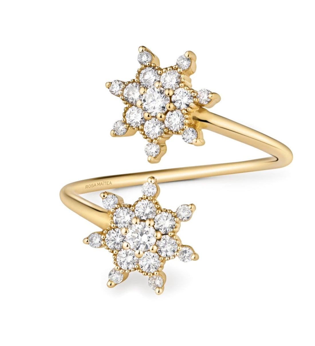 El anillo pesa 5,19 gramos de oro reciclado. El engaste presenta 7 estrellas de 105 diamantes reciclados de un quilate. Queda magnífico para llevar solo o combinado con otros modelos de Rosa Maïtea como los anillos Bonne Etoile o Arcoiris.