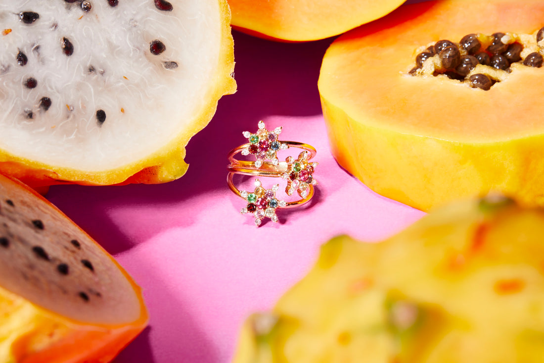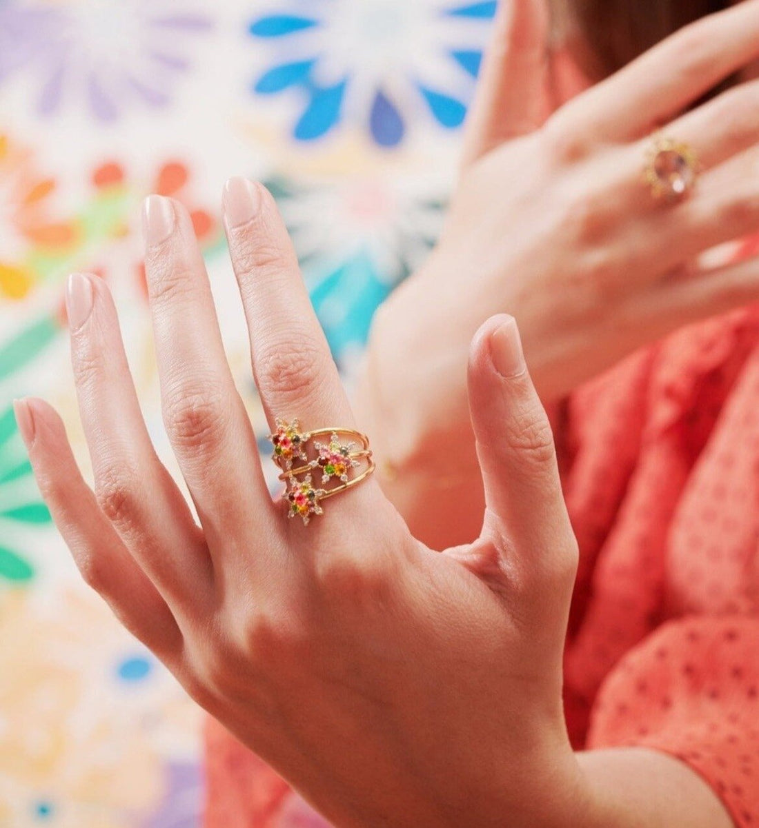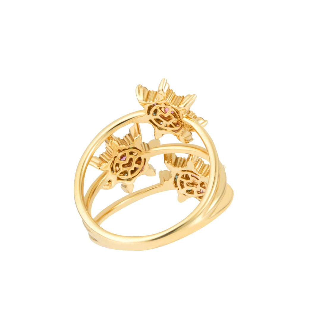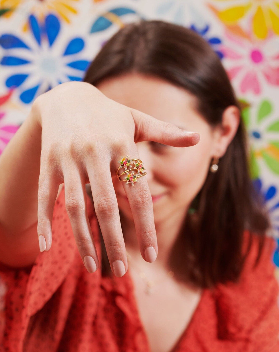 El anillo Constellation Arcoiris es la versión arcoíris del anillo Constellation Bonne Étoiles de Rosa Maïtea. Está elaborado con oro reciclado de 18 quilates y engastado con piedras 100 % rastreables: espinelas y granates de Tanzania en colores vibrantes.