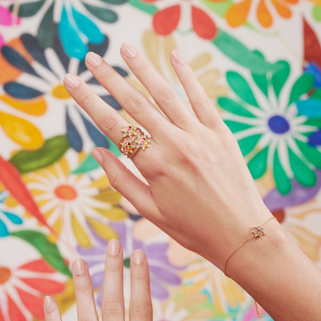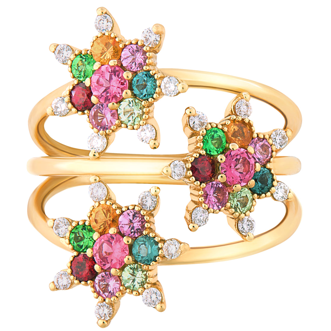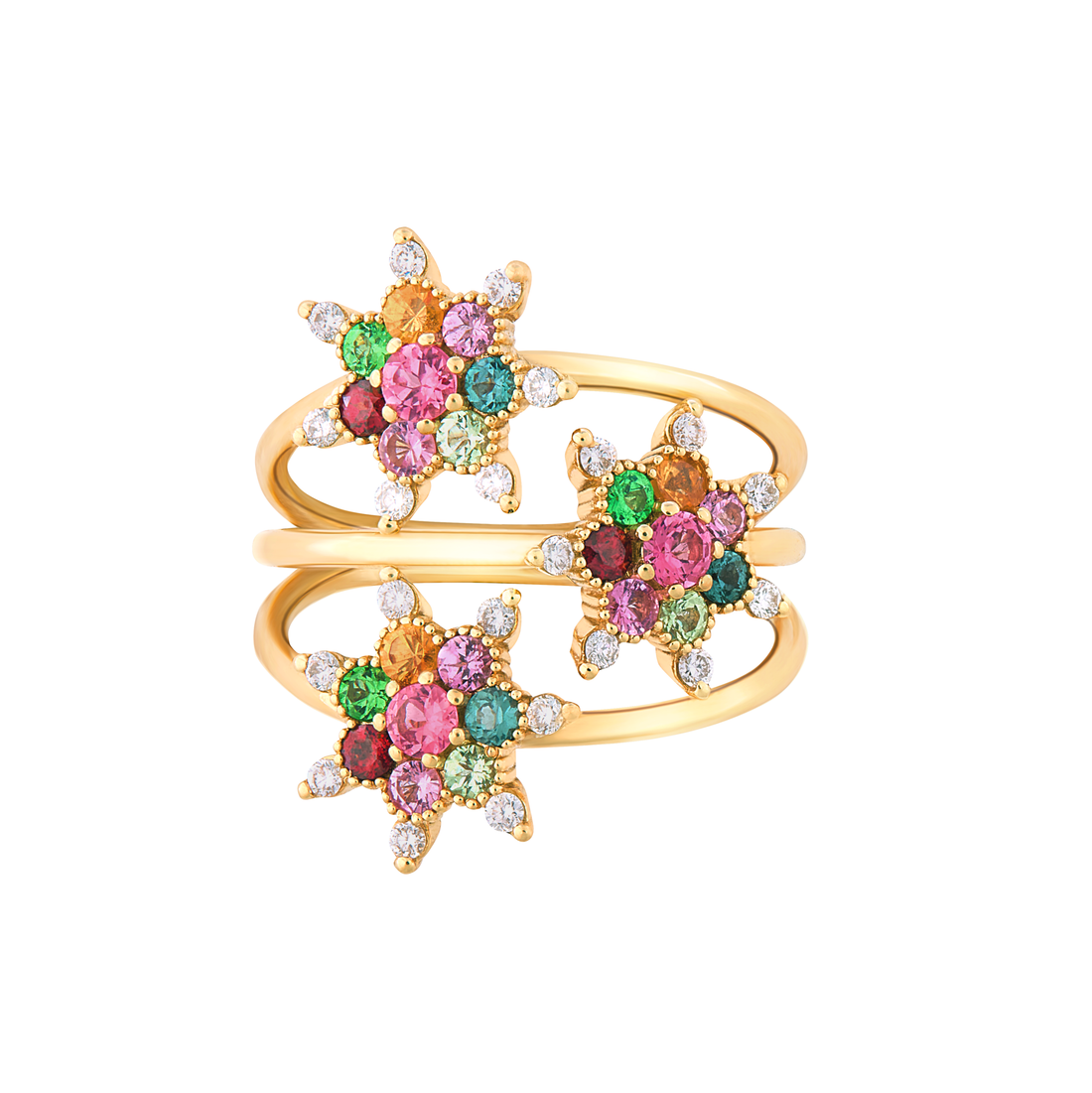 El anillo ético Constellation Arcoiris surge alegremente de la mano en un ramo de estrellas multicolores.
