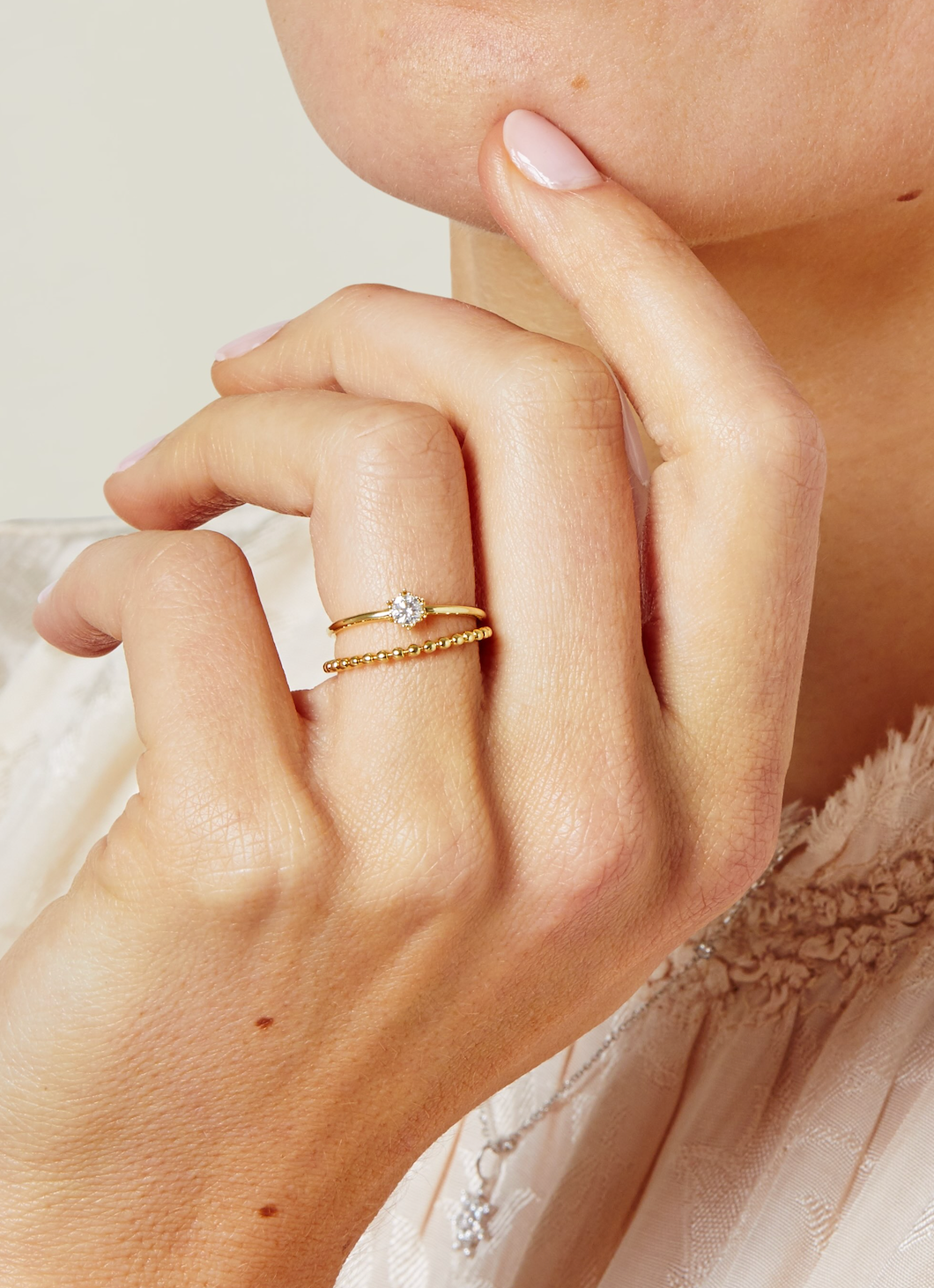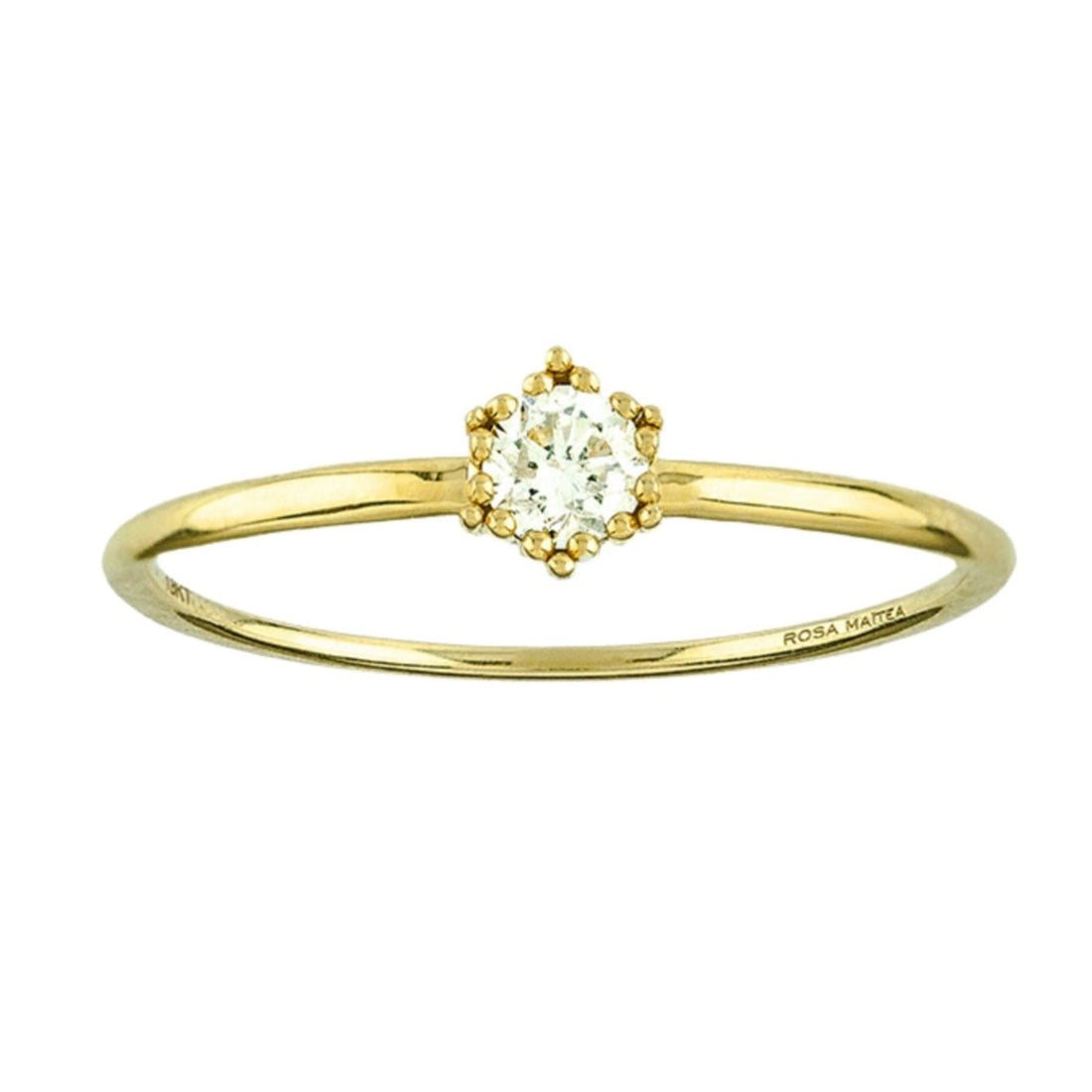 Resaltando la belleza de los diamantes con un engaste único, adornado con tres cuentas de oro reciclado montadas en forma de estrella, Rosa Maitea crea un anillo original. Esta ambientación, firma de Rosa Maïtea, recuerda el simbolismo mágico del número 3 como unión de perfección, equilibrio y amor infinito.