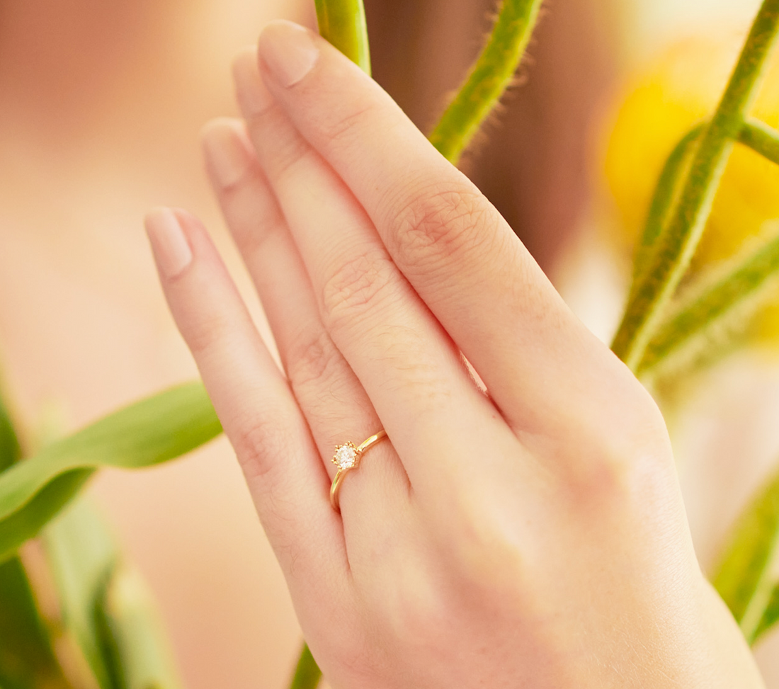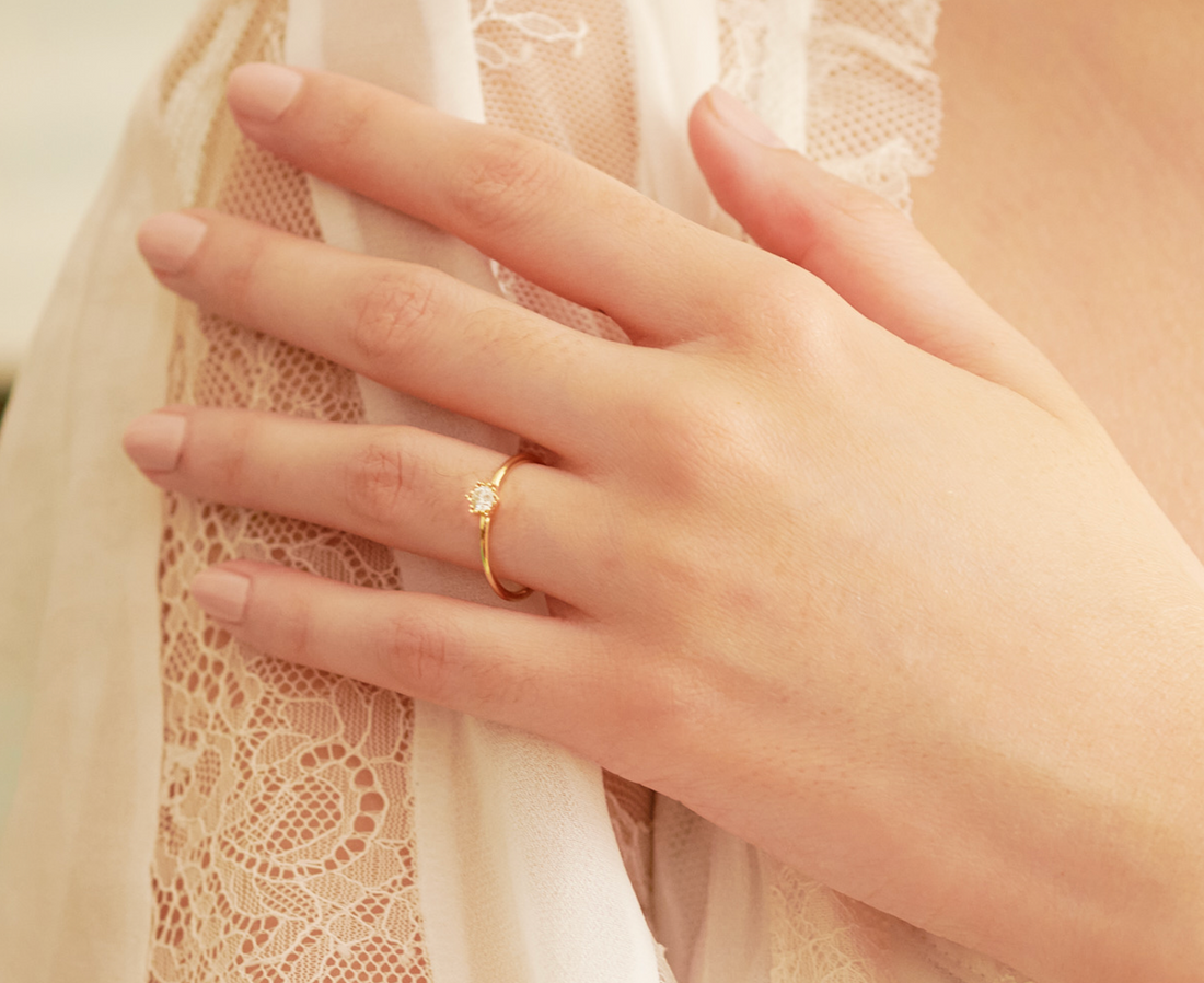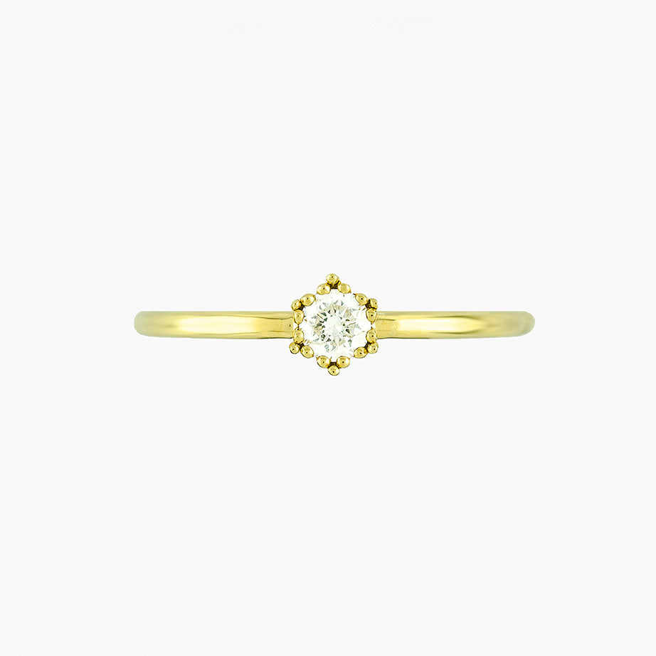 El motivo central del anillo está compuesto por un diamante talla brillante de 0,15 quilates. El motivo central tiene un diámetro de 5,6 mm. La montura de oro reciclado de 18 quilates pesa 1,34 gramos.