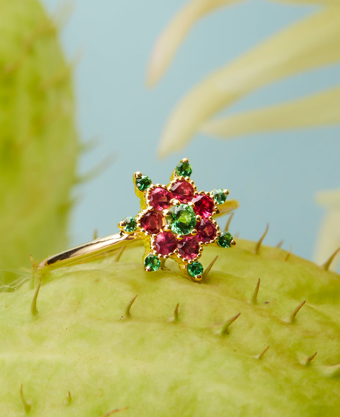 La estrella mide 14 mm de altura y está compuesta por 7 granates tsavoritas amarillas y 8 espinelas rosas de 0,495 quilates. El diámetro de la estrella es de 10,7 m. El anillo está fabricado en oro reciclado de 18 quilates, pesa 2,11 gy tiene un diámetro de 1,3 mm.