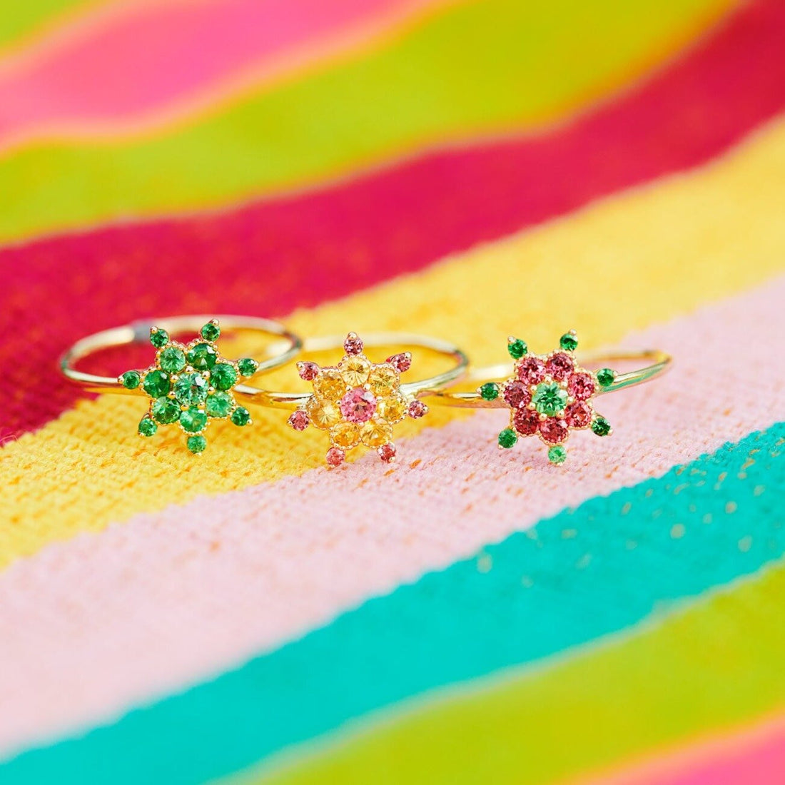 En oro reciclado de 18 quilates, el anillo ético Joie irradia su preciosa y colorida alegría en los dedos. Está compuesto por granates azafrán y espinelas rosadas que se pueden rastrear desde la mina hasta la caja.