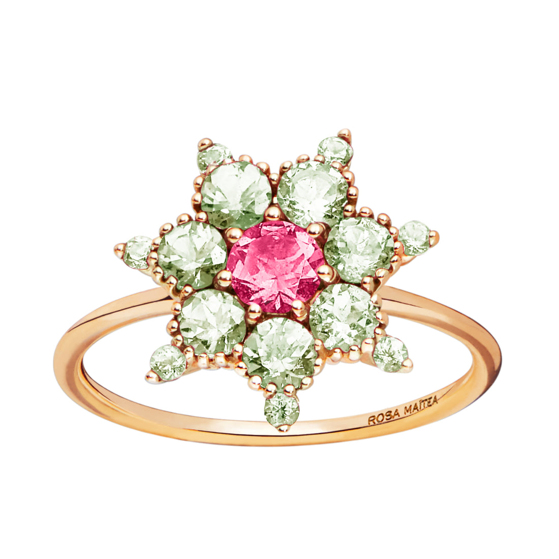 La estrella mide 14 mm de altura y está compuesta por 14 granates verdes y 1 espinela de color rosa intenso que suman 1.480 quilates, todos cortados en talla redonda. El anillo está fabricado en oro reciclado de 18 quilates, pesa 3,19 gy tiene un diámetro de 1,7 mm.