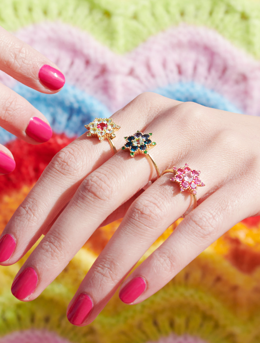 Detrás de la estrella está grabado el corazón con 5 rayos, el logo de Rosa Maïtea. El anillo Esperanza se puede llevar solo, o apilado en todos los dedos de la mano o en combinación con los anillos Etoiles todos en diamantes o con otros colores.
