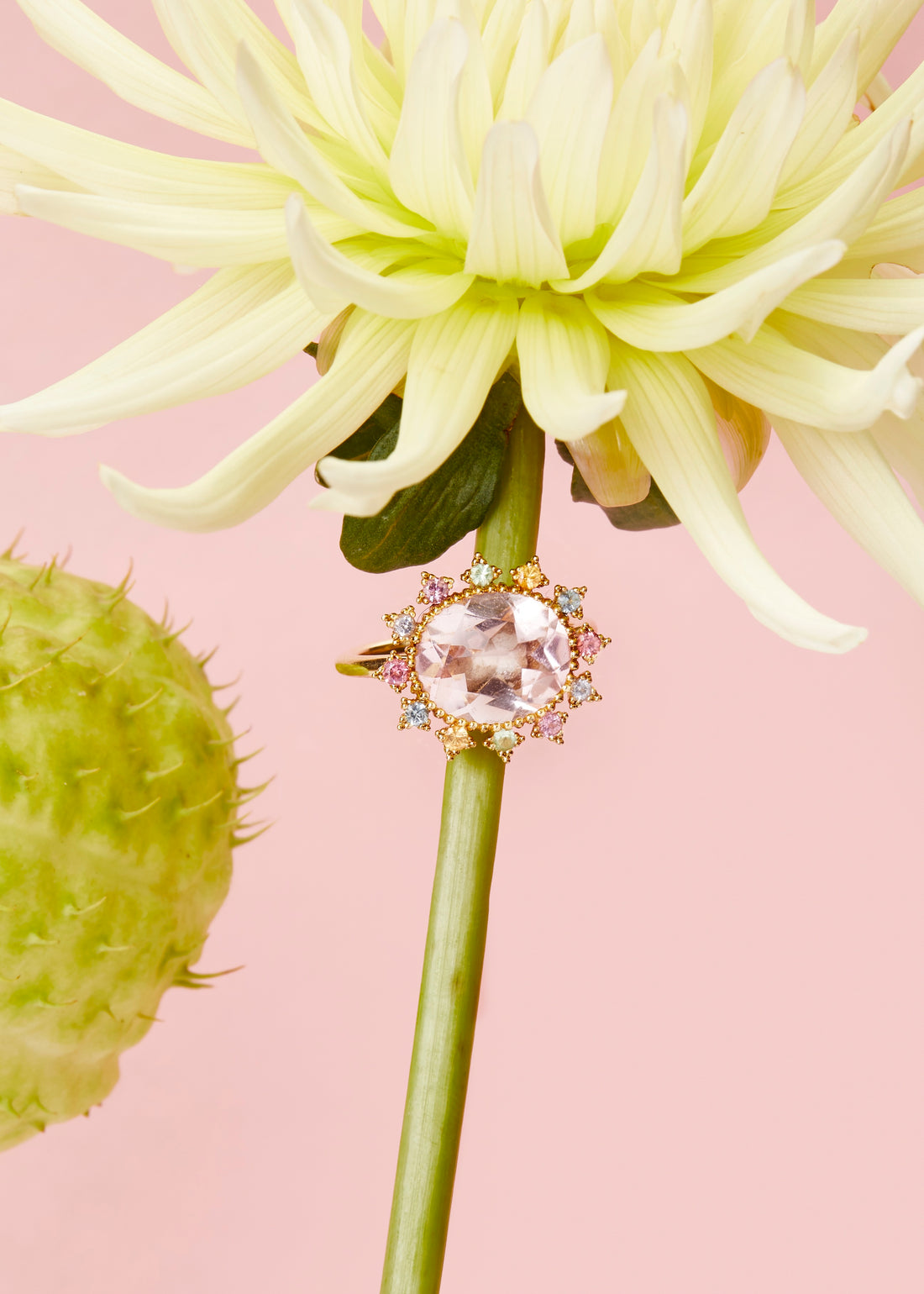 Revisado en un estilo contemporáneo, el anillo La Favourite se vuelve atemporal adornado con turmalina rosa 100% rastreable . Su corazón de hermosa forma ovalada está bordeado por una vibrante fantasía de granates y espinelas multicolores.