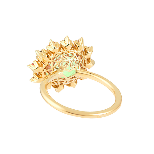 Escondido bajo su pistilo de piedras finas, un corazón secreto de oro, coronado con una doble banda de pequeños corazones calados, deja brillar la luz, magnificando aún más el brillo de la turmalina. El corazón elaborado con 5 rayos actúa como un talismán que siempre protegerá, una muestra de amor directamente sobre la piel.
