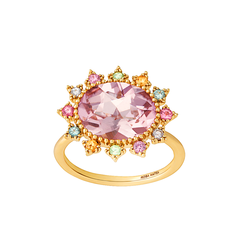 El anillo está fabricado en oro reciclado de 18 quilates y pesa 5,69 gramos. La hermosa piedra central es una turmalina ovalada de color rosa pálido de 4,51 quilates. Su tamaño es de 12 mm x 10 mm. Las espinelas y granates, alrededor de la piedra central, son de 0,45 quilates. El anillo mide 16,8 mm de alto, 18 mm de ancho y 6,5 mm de alto. El ancho del anillo es de 1,40 mm.