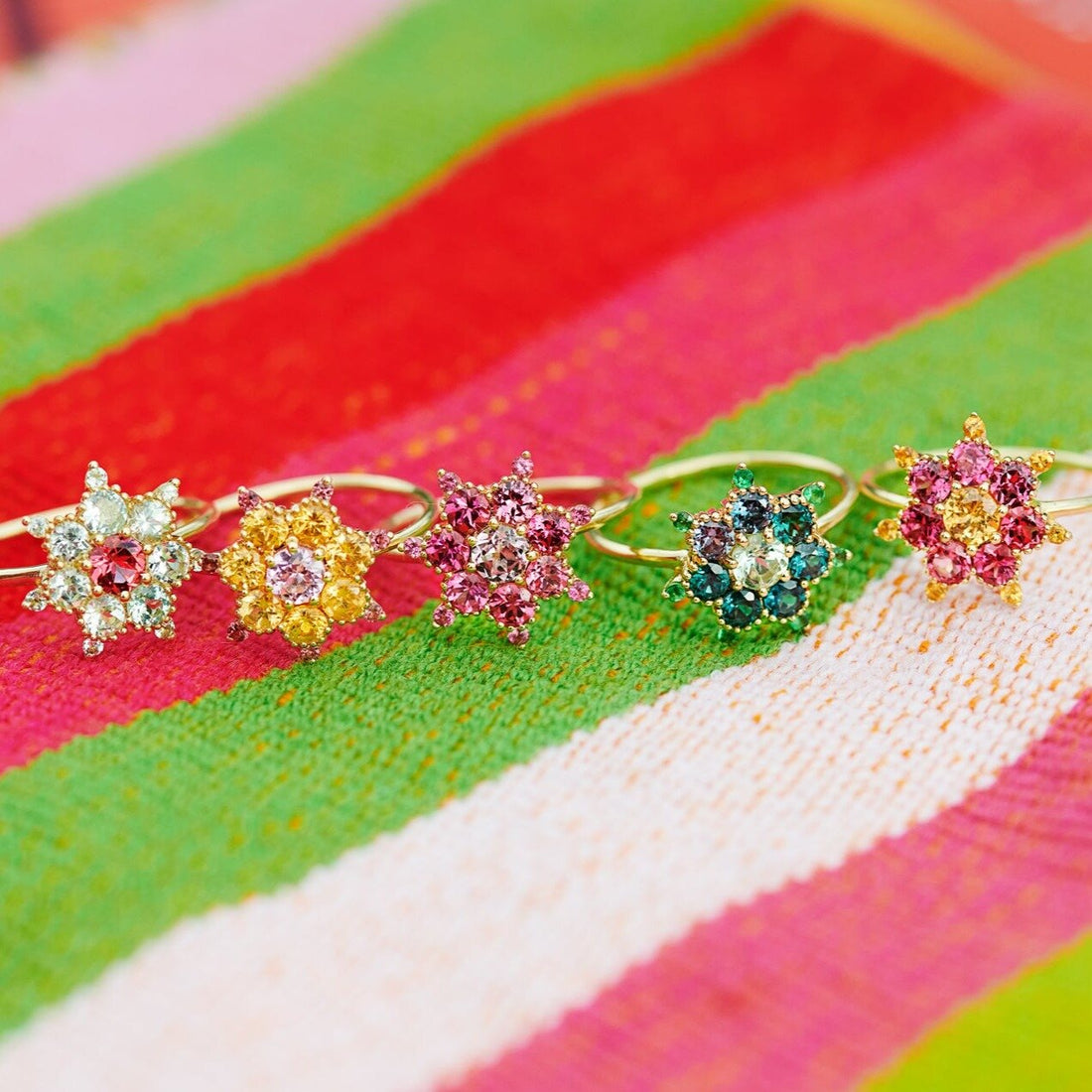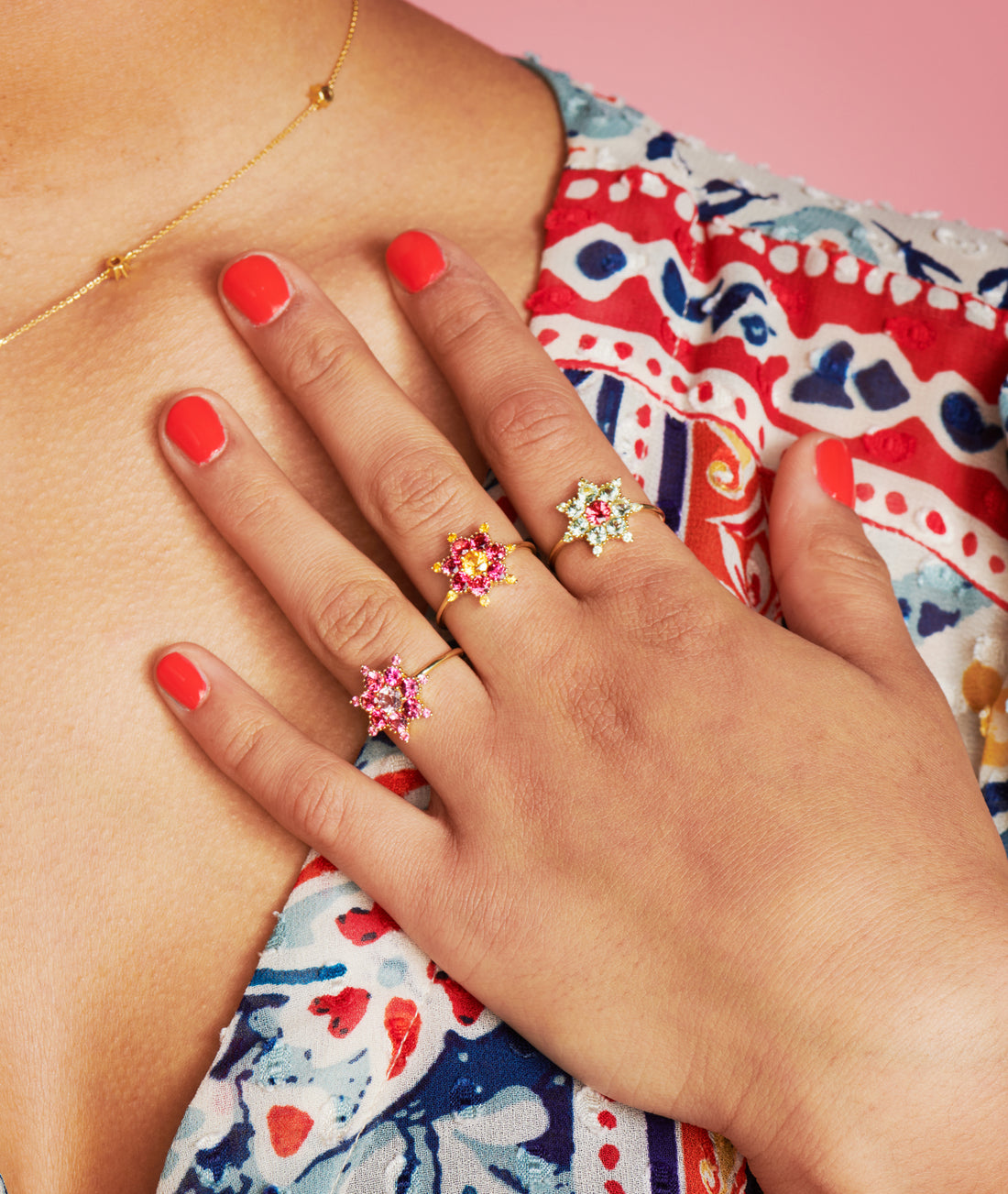 Detrás de la estrella está grabado el corazón con 5 rayos, el logo de Rosa Maïtea. El anillo Paz se puede usar solo, apilado en todos los dedos de la mano o en combinación con los anillos Etoiles totalmente de diamantes o los anillos Arcoiris multicolores.