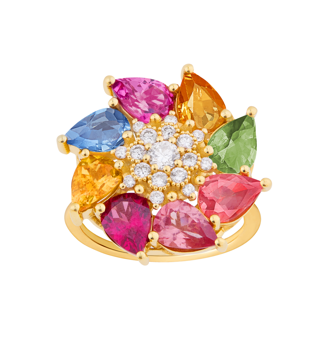 En or recyclé 18 carats, la bague pèse 8,91 grammes. Le sertissage comporte 15 diamants recyclés de 0,415 carats, 8 spinelles et grenats de taille poire: (7x4) champagne, Mint, rhodolite, rose et rouge, rose bébé, spessartite gris et bleu, pour un poids total de 6,2 carats.