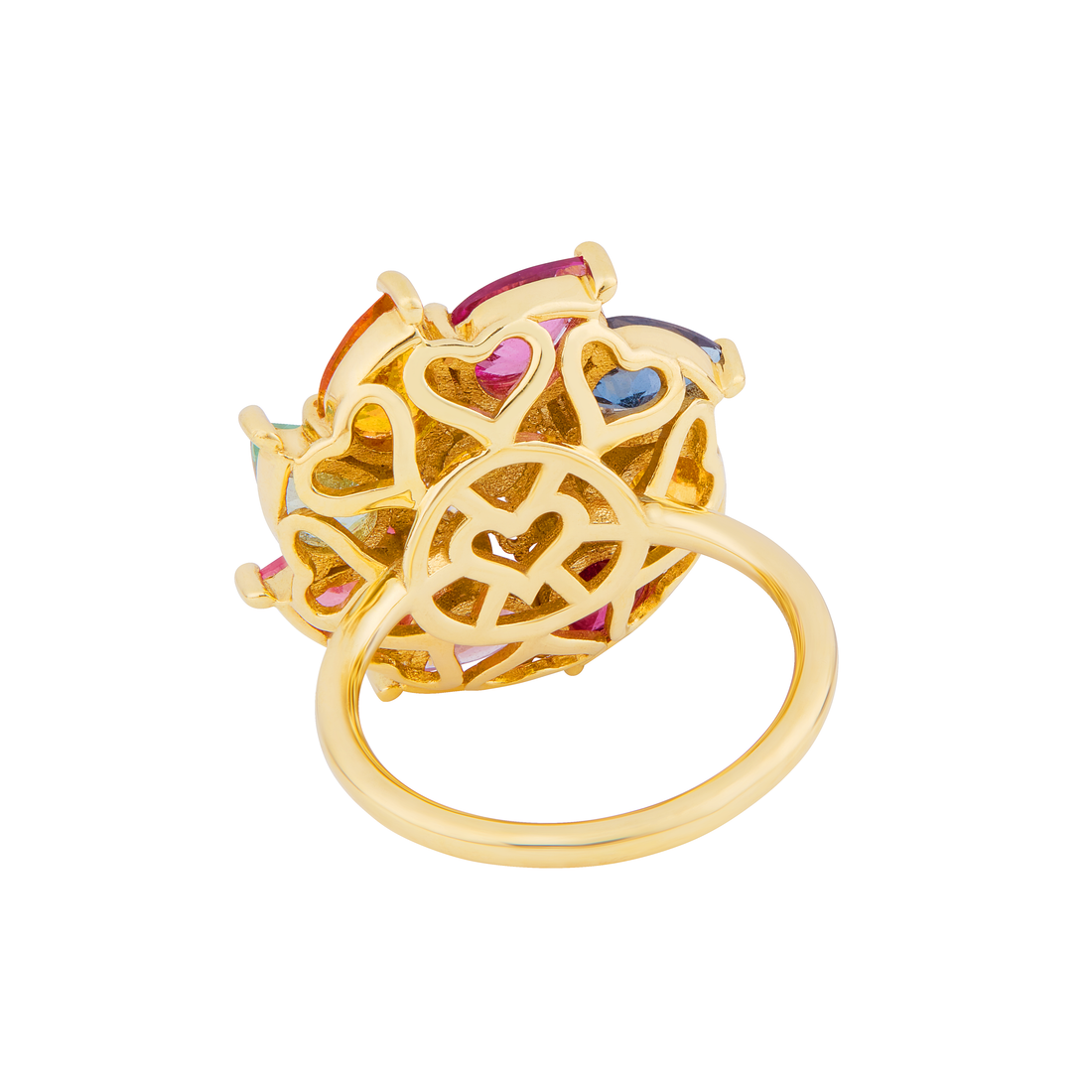 Ouvragé sous la précieuse rosace, un cœur d'or secret laisse briller la lumière sous les pierres, magnifiant encore leur éclat. Le cœur cerclé d’un bandeau de six autres petits cœurs ajourés agit comme un talisman qui protégerait toujours, un gage d’amour à même la peau.