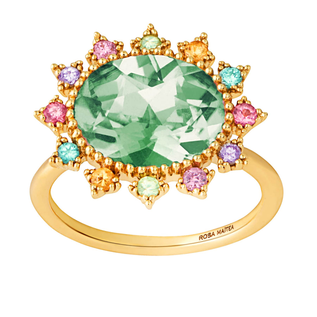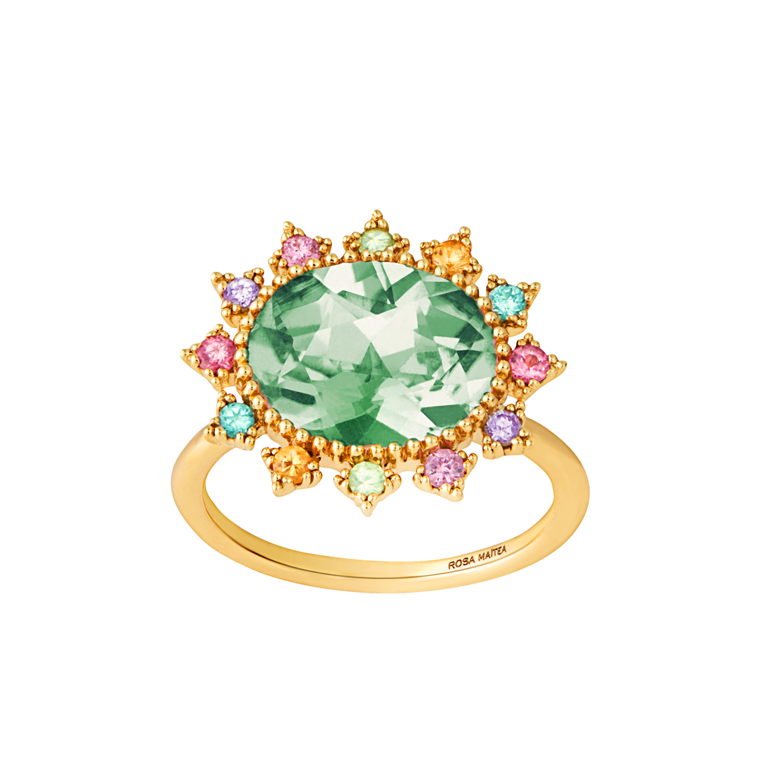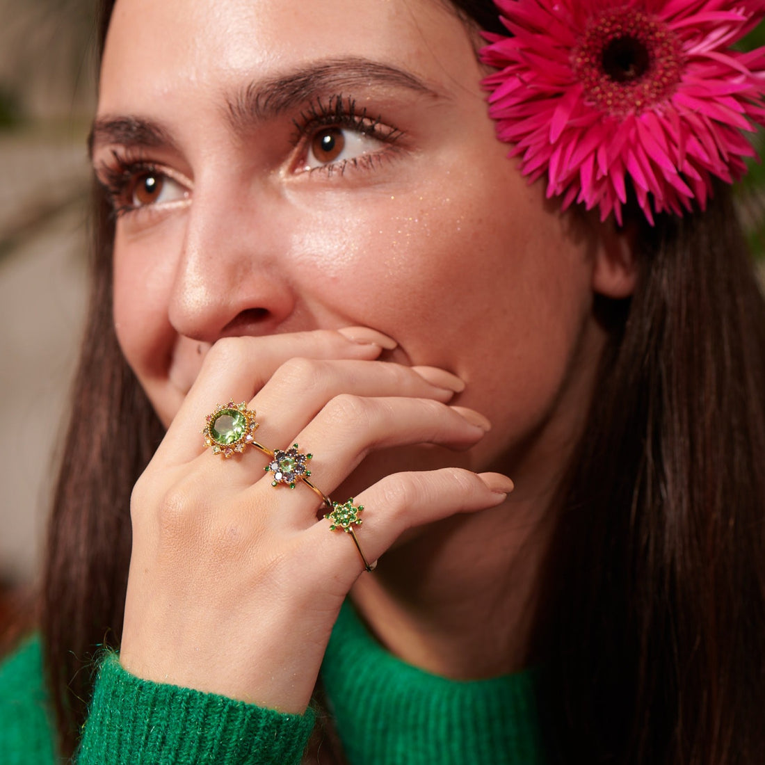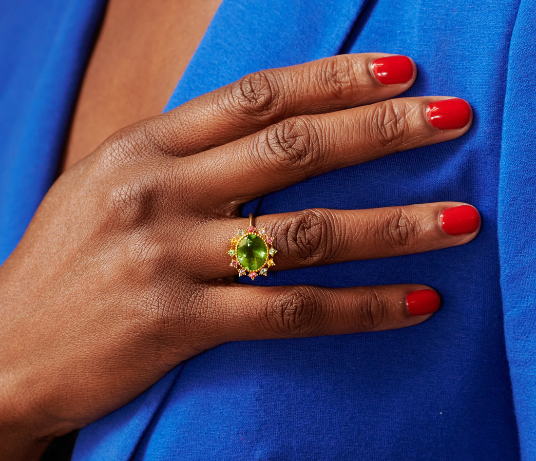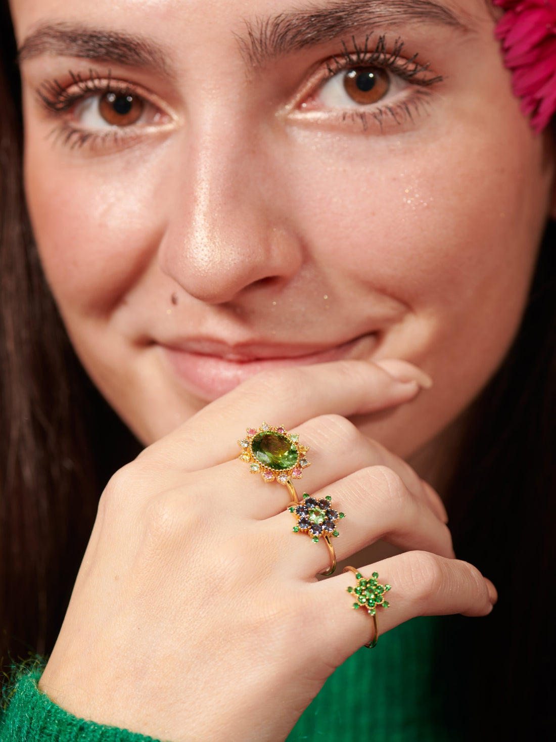 Revisitée en mode contemporain, la bague La Favorite devient intemporelle parée d’une tourmaline verte 100% traçable. Son cœur joliment taillé en ovale est frangé d’une vibrante fantaisie de grenats et de spinelles multicolores.