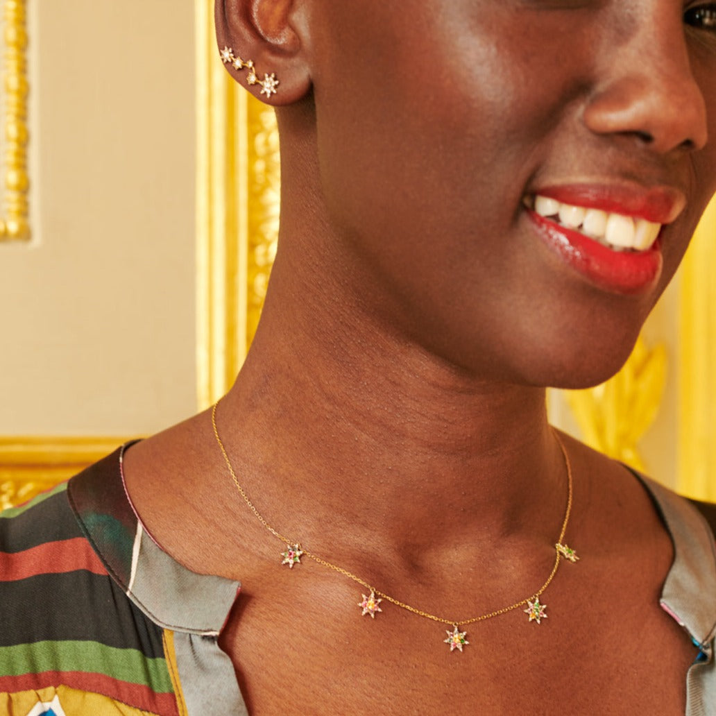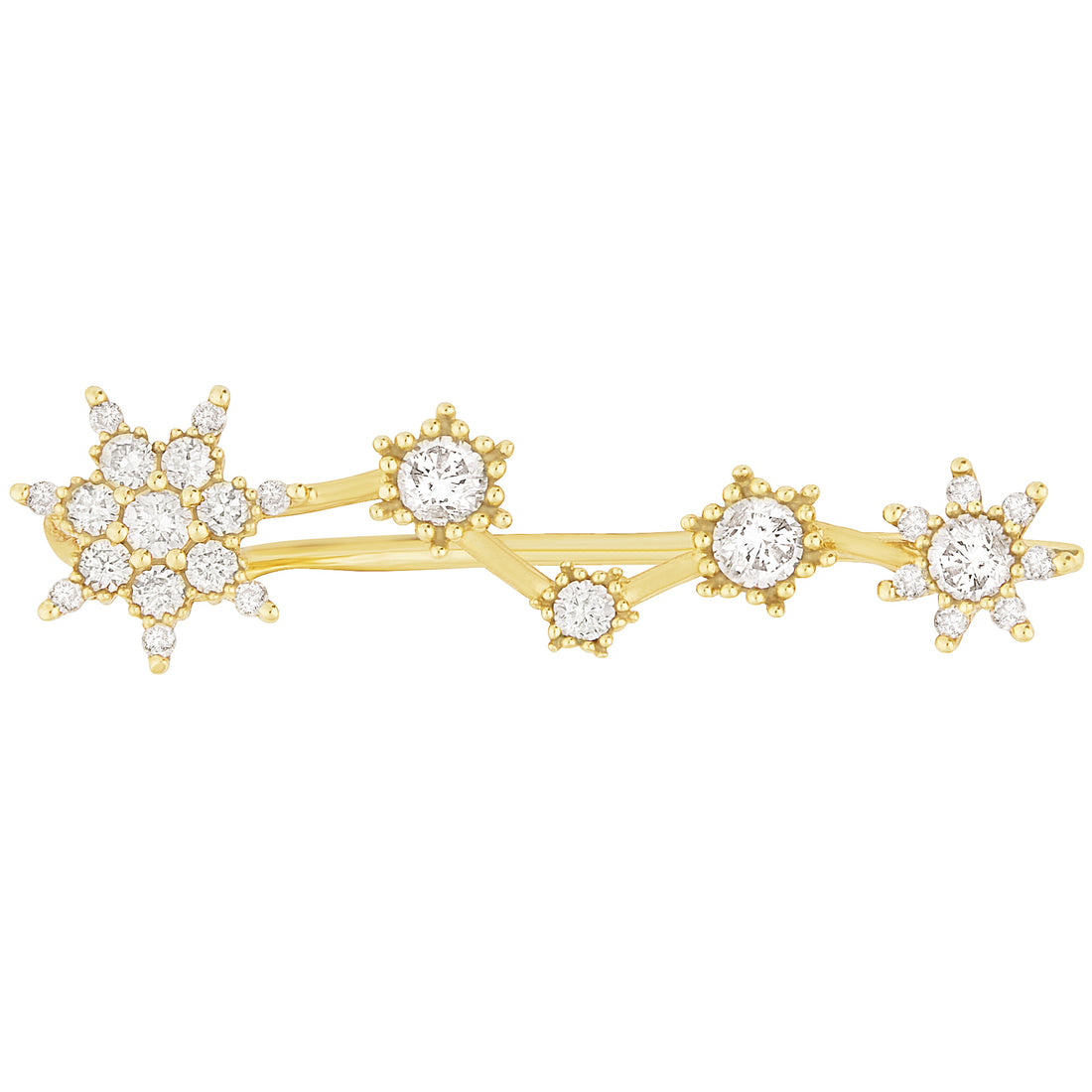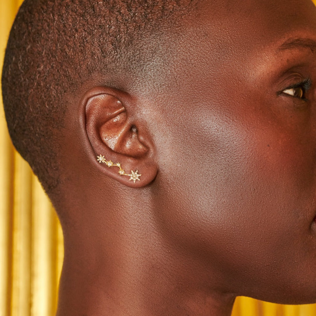 Disparándose sobre la oreja como una estrella fugaz, la banda sonora de Ethique jardin ilumina el óvalo del rostro con sus diamantes para un look muy contemporáneo, ¡en el firmamento de las estrellas!