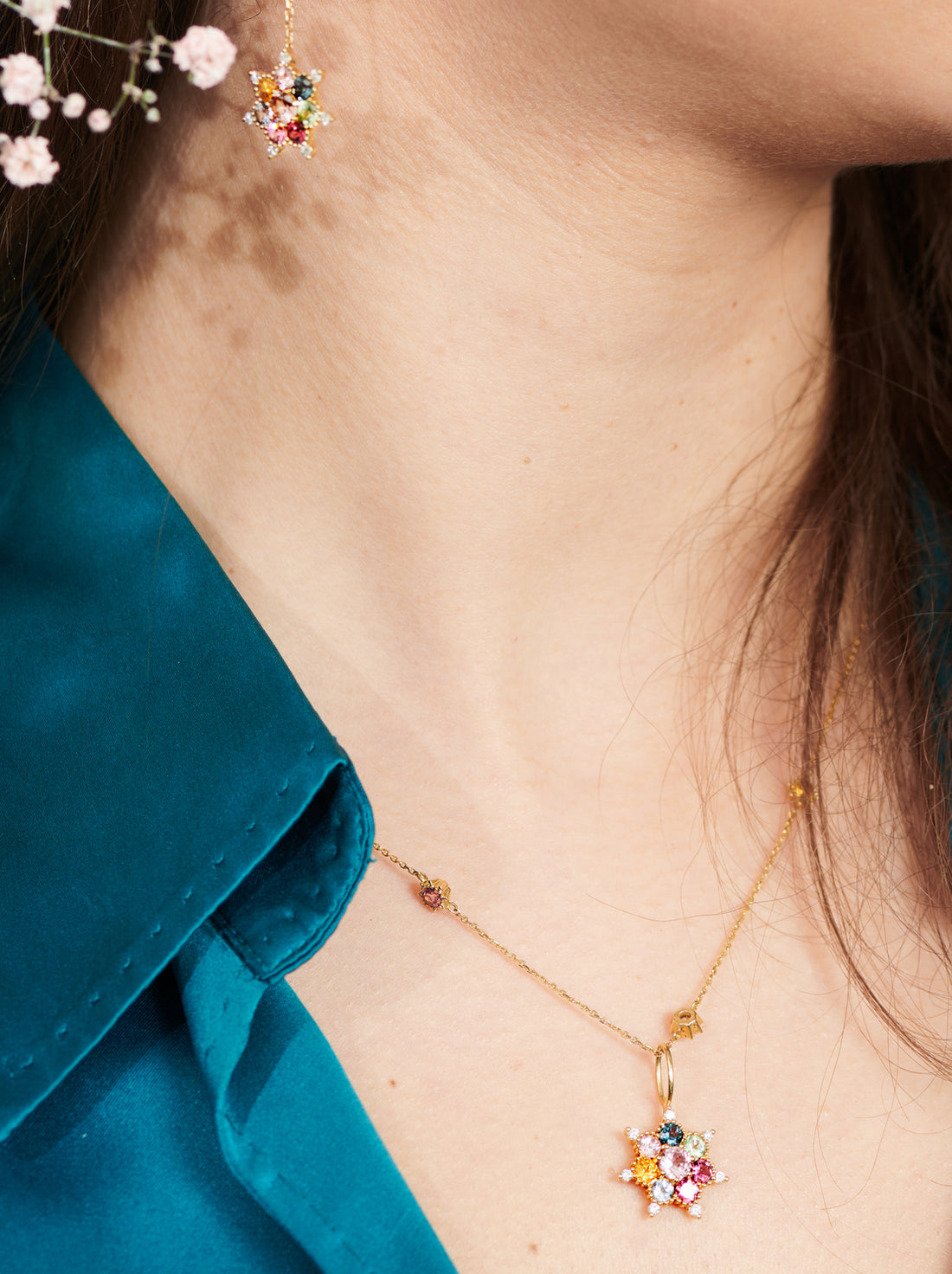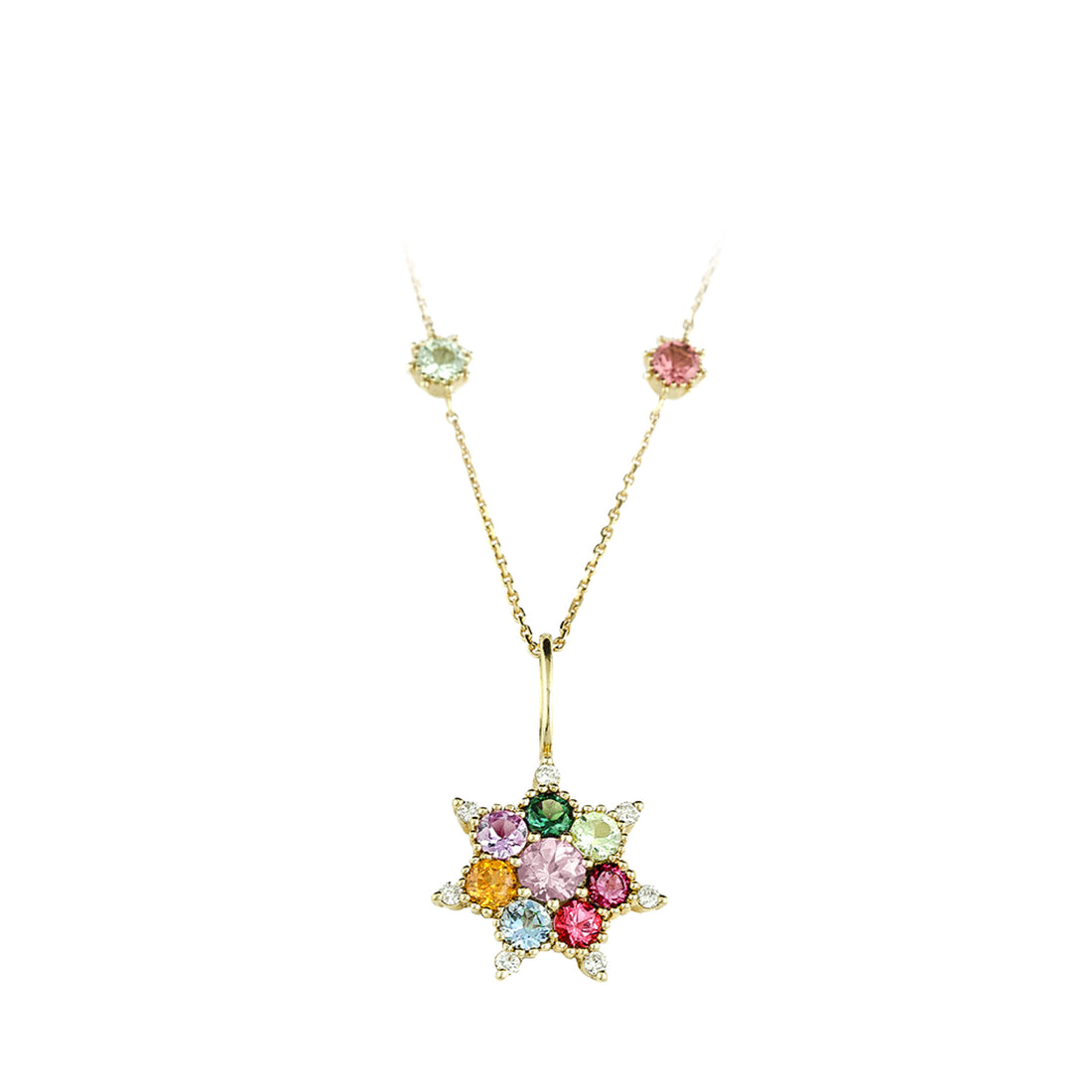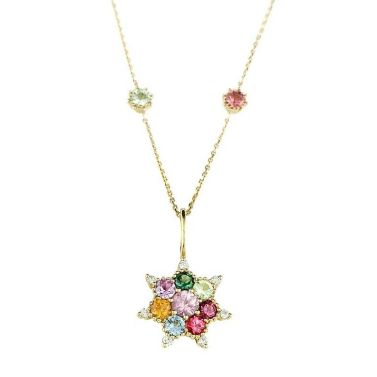 La cadena Arcoiris es la versión arcoíris de la cadena Bonne Étoile de Rosa Maïtea. La cadena está hecha de oro reciclado y engastada con piedras finas 100 % rastreables de Tanzania en magníficos colores brillantes.