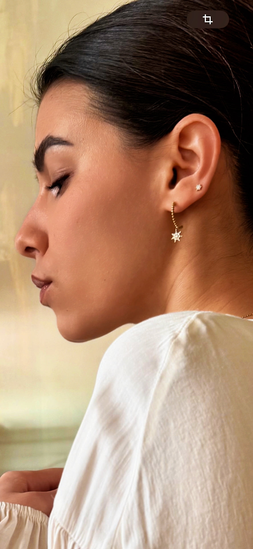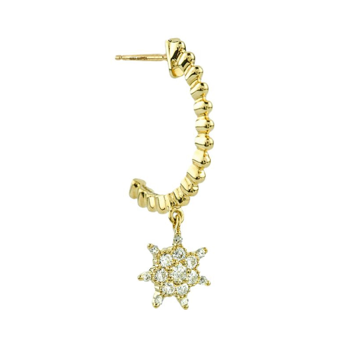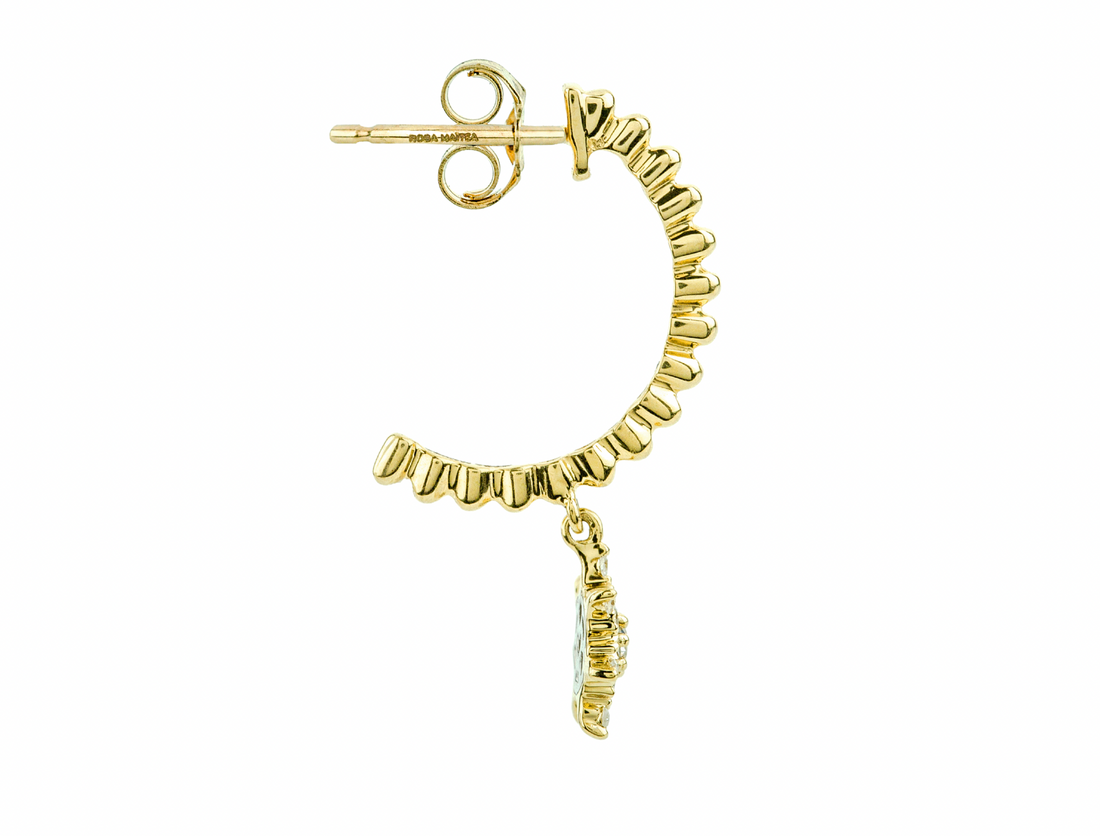 El aro de media anilla de oro reciclado está esculpido con una decoración “milgrain” que le confiere una textura nacarada muy bonita y un brillo único. Suspendida de los aros, una estrella hecha de diamantes reciclados se balancea con movimientos y gestos bajo el brillo de las luces cambiantes. Ilumina el rostro y el corazón con la brillante felicidad de llevar joyas éticas.
