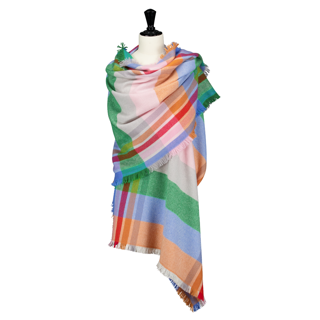 Ses carreaux aux nuances de rose poudré, bleu ciel, vert prairie et orangé doux, contrastés par des touches de gris perle et rouge profond, créent un jeu de couleurs harmonieux et joyeux.