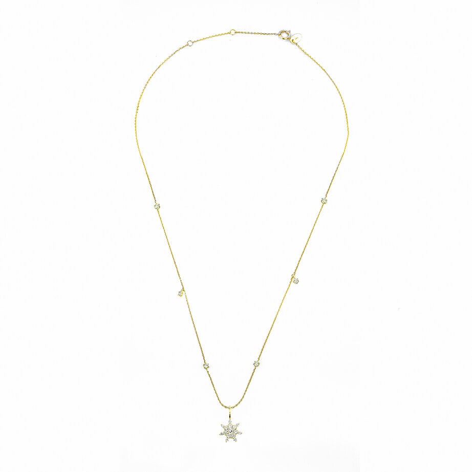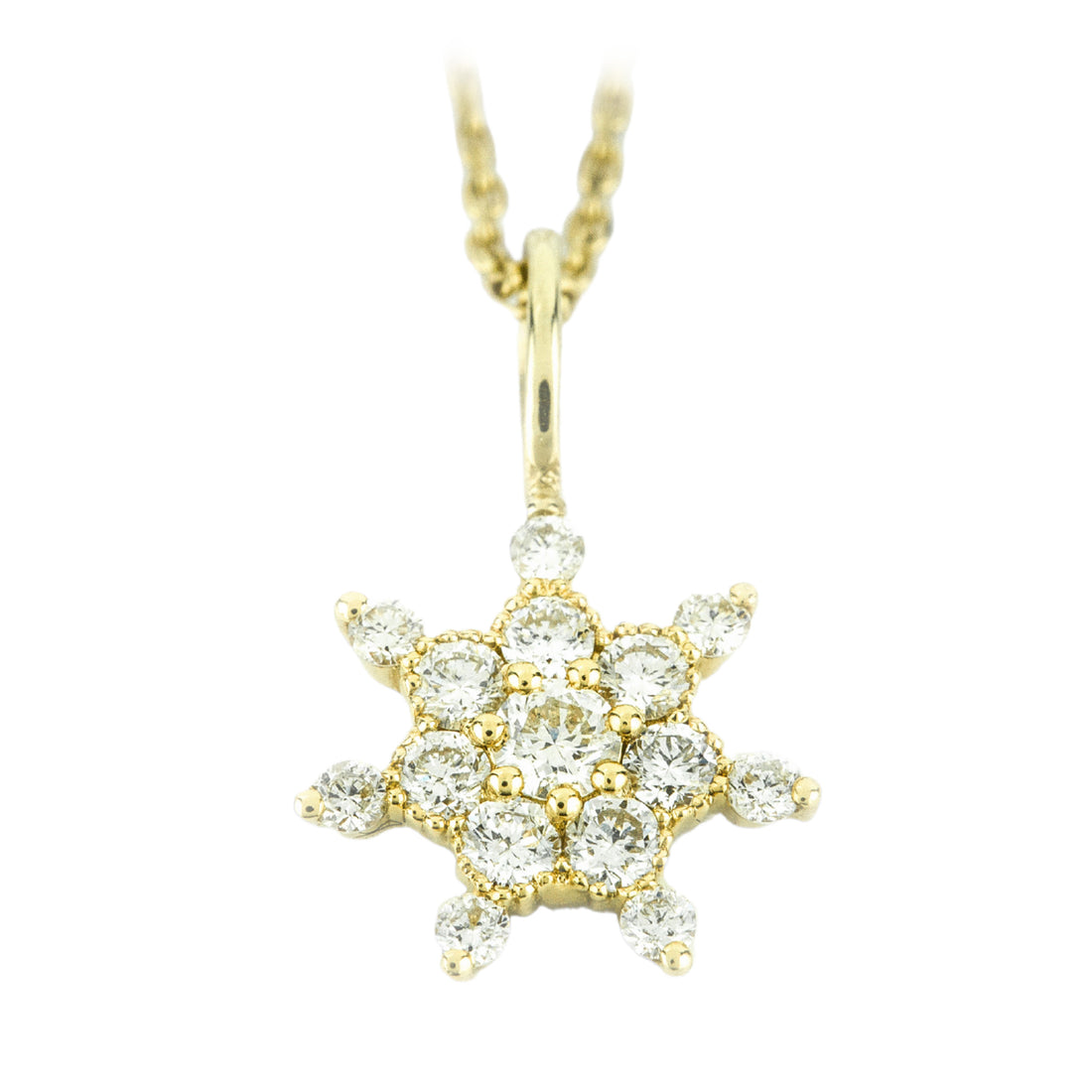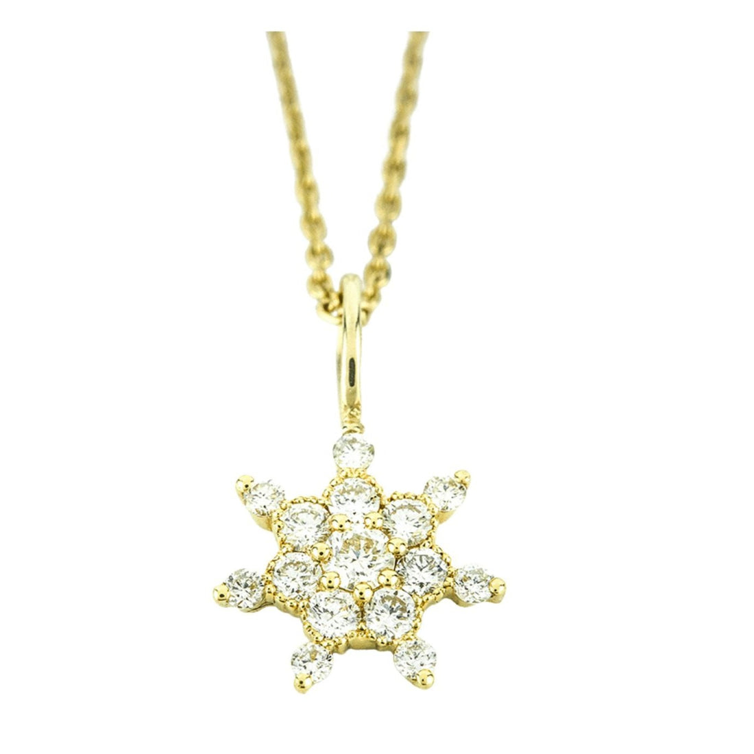 El diseño de estrella en oro reciclado de 18k está compuesto por 15 diamantes reciclados de 0.250 quilates. El colgante pesa 0,58 gramos en oro.