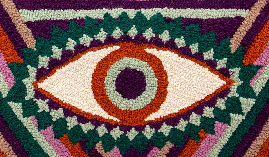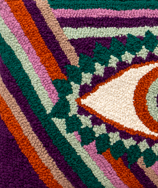 Au centre, un œil brodé en blanc, orange et vert profond, cerclé de motifs géométriques hypnotiques, veille sur son porteur. Le fond violet intense et les lignes aux teintes de rose, vert et terracotta apportent une profondeur à cette pièce unique. Un pompon assorti complète l’ensemble avec style.