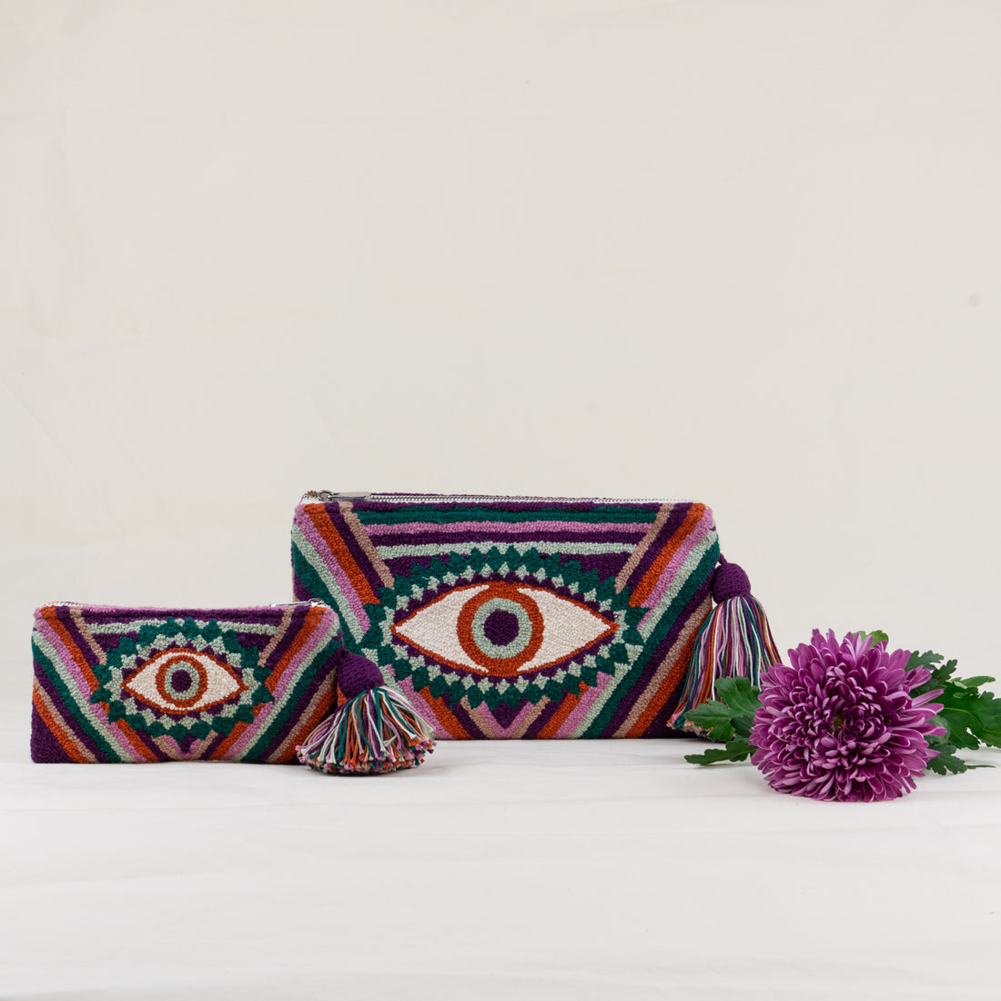 Ce clutch brodé à la main incarne un savoir-faire artisanal unique, transmis par les femmes indigènes de Colombie et du Venezuela, avec le soutien de l’association suisse Mama Tierra. Inspiré des croyances ancestrales, il met en avant l’œil protecteur, un symbole universel de clairvoyance et de force spirituelle.