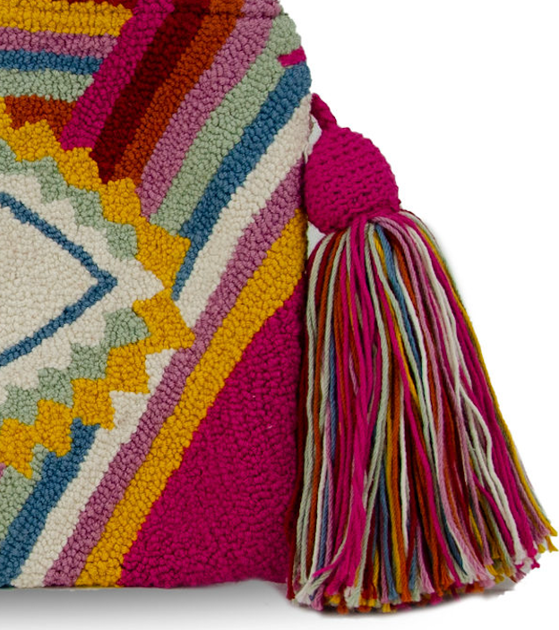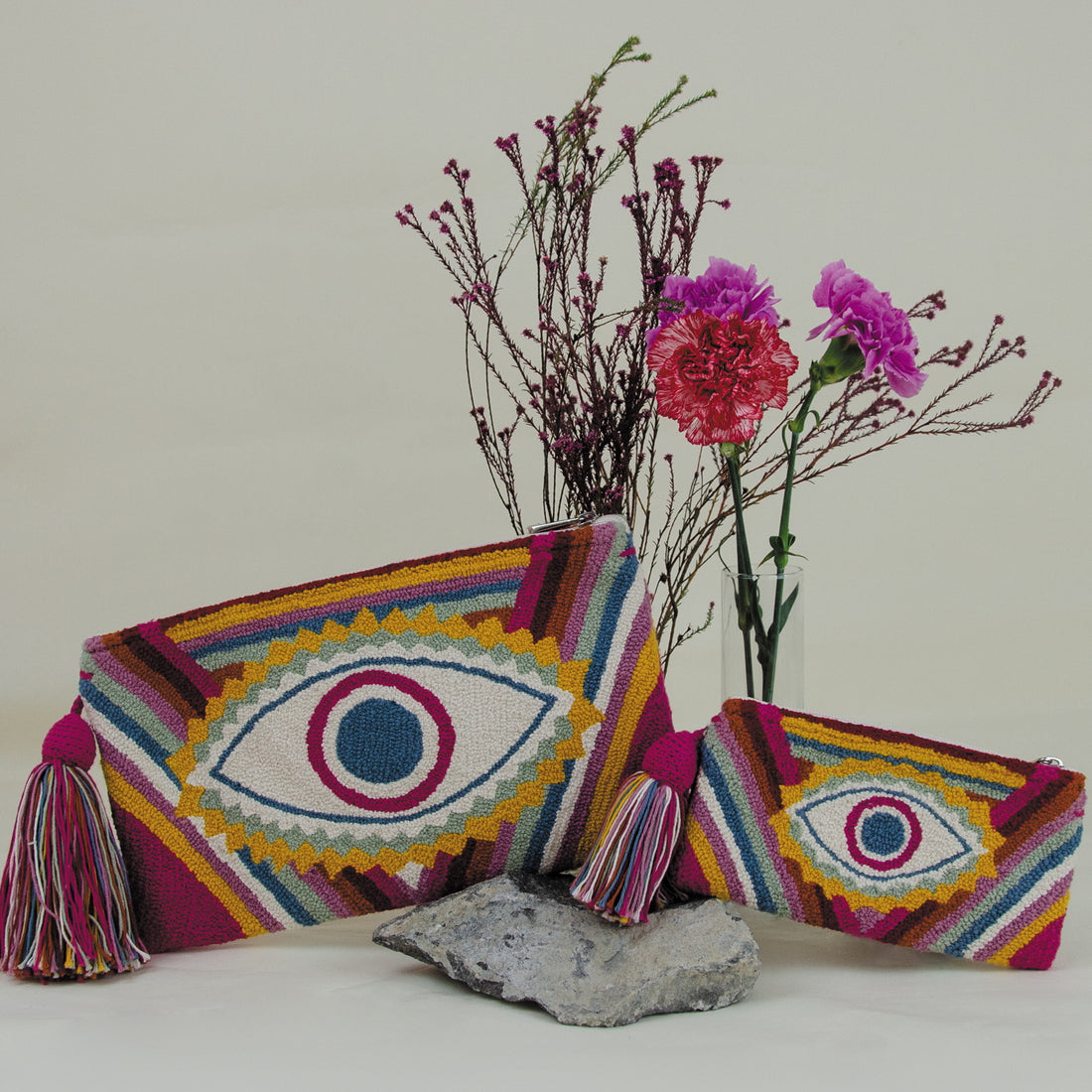 Ce clutch brodé à la main est une création artisanale unique, conçue par les femmes indigènes de Colombie et du Venezuela avec le soutien de l’association suisse Mama Tierra. Inspiré des croyances ancestrales, il met en avant l’œil protecteur, symbole universel de vigilance et de clairvoyance, revisité dans une explosion de couleurs vibrantes.