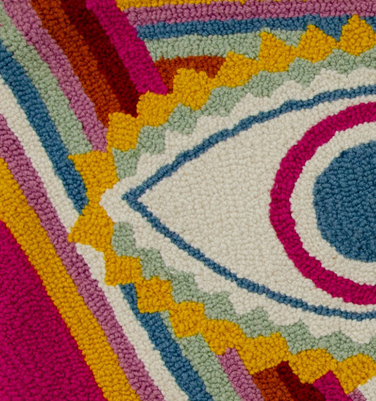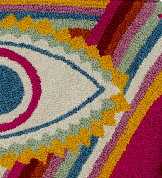 Au centre, un œil sacré brodé en blanc et bleu intense, entouré d’ondes dorées, évoque la force et la protection. Le fond rose fuchsia éclatant, agrémenté de motifs géométriques en bleu, jaune, rouge et orange, apporte une énergie solaire et audacieuse. Une pampille assortie vient compléter cet accessoire d’exception.