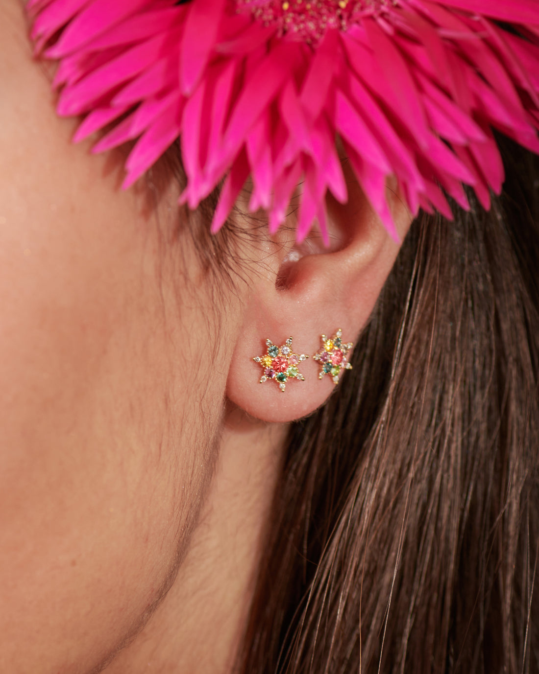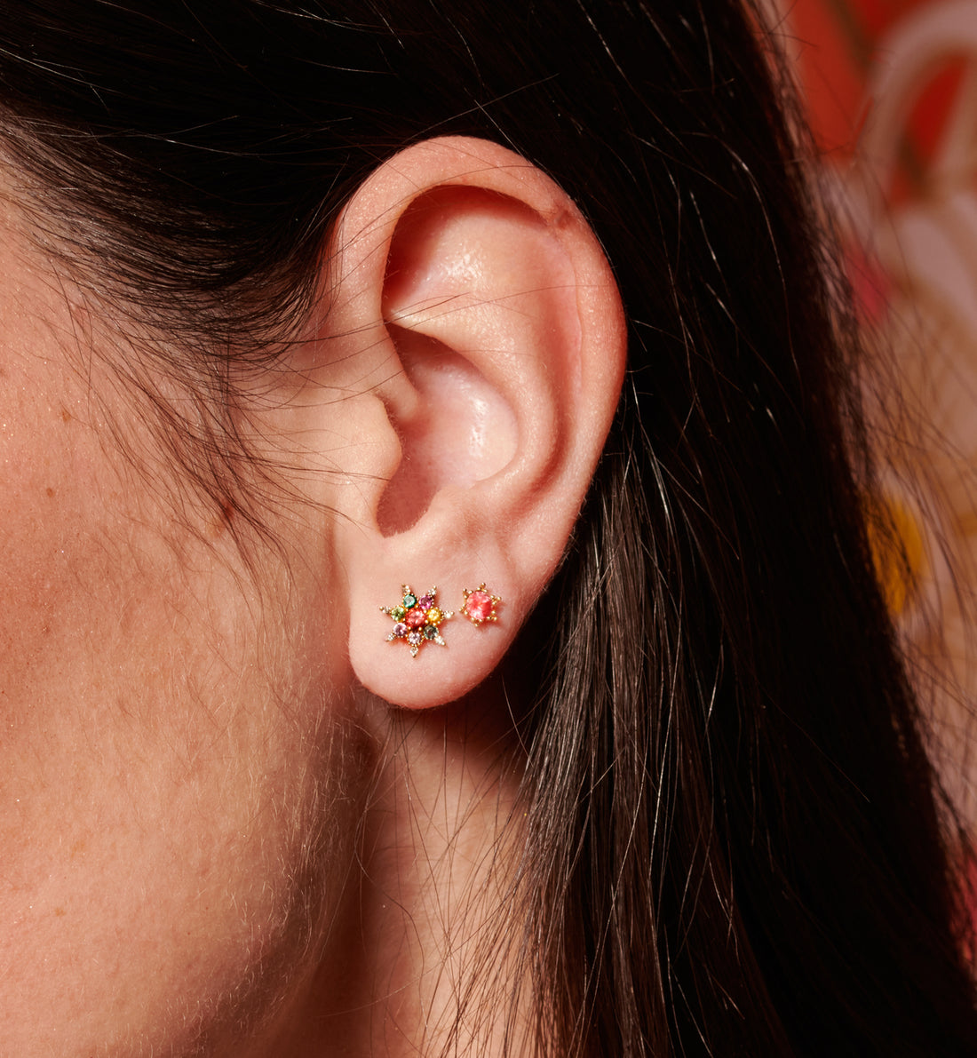 El engaste con motivo de estrella está formado por 7 diamantes reciclados talla brillante de 0,02 quilates y 8 piedras finas 100% trazables : champán, granates color menta, rodolita roja, espinelas rosa bebé, espinelas grises y marinas.