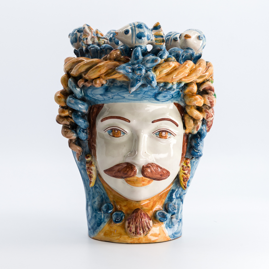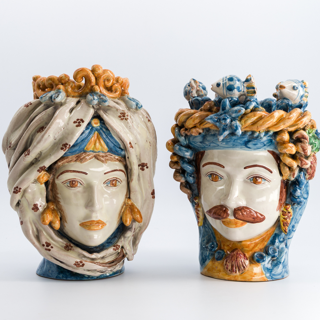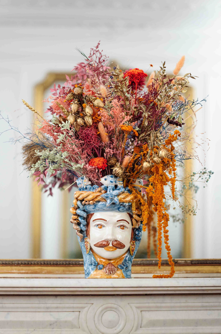 Ce vase masculin incarne toute la majesté et la force des légendes siciliennes. Son regard perçant, sa barbe finement sculptée et son turban orné de nuances profondes font de lui une œuvre d’art intemporelle. Seul, il impose une présence noble et mystérieuse, en duo avec la tête féminine, il raconte une histoire d’amour et de tradition.