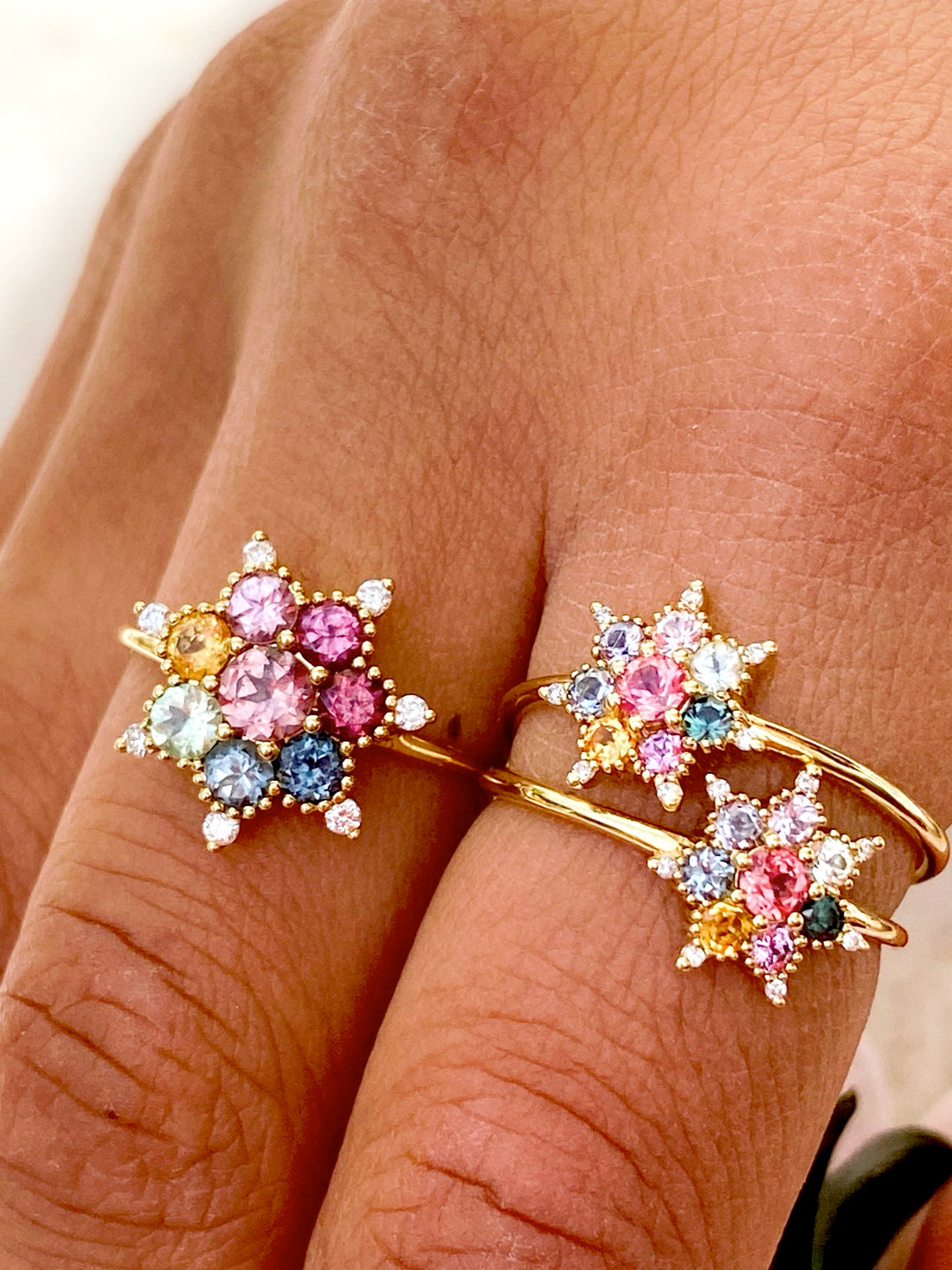 La bague se porte sur n’importe quel doigt de la main, seule ou avec les autres modèles de bague Bonne Etoile ou Arcoiris, ou encore avec vos propres bagues.