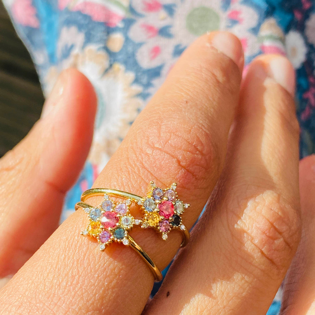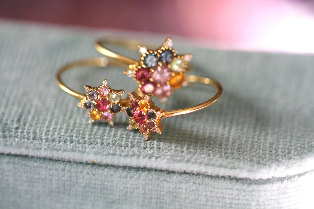 La bague éthique Arcoiris est la version arc-en-ciel de la bague Bonne Étoile de Rosa Maïtea. Variation polychrome et créative sur le thème de l’étoile, la bague est en or et diamants recyclés et sertie de pierres fines 100% traçables de Tanzanie aux magnifiques couleurs vives.