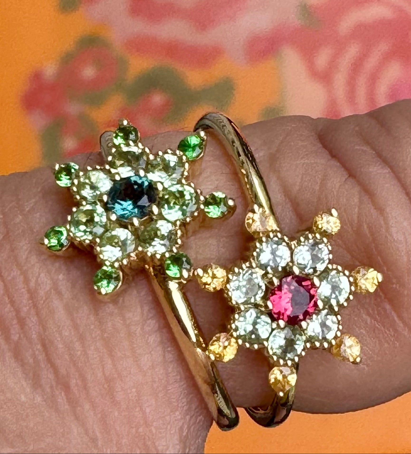 Derrière l’étoile est gravé le cœur à 5 éclairs, logo de Rosa Maïtea. La bague Mimosa se porte seule, ou en accumulation sur tous les doigts de la main ou encore en combinaison avec les autres bagues Arcoiris.
