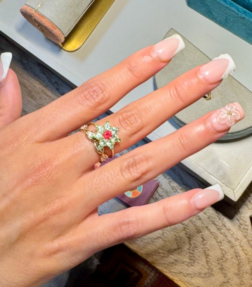 L’étoile mesure 14 mm d’hauteur et est composée de 7 grenats mint, 7 tsavorites vertes et 1 spinelle rose. L'anneau est en or recyclé 18 carats, pèse 3,19 grammes et a un diamètre de 1,5 mm.