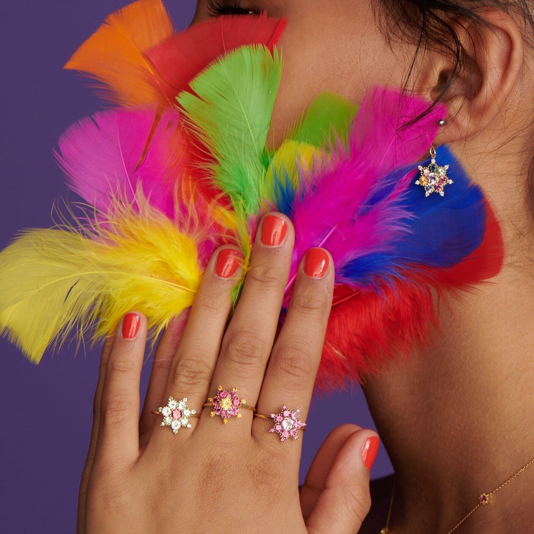 La Boucle d’oreille Arcoiris se porte seule ou combinée avec d’autres boucles d’oreilles Rosa Maïtea, en parure avec les puces et/ou la bague de la même collection.