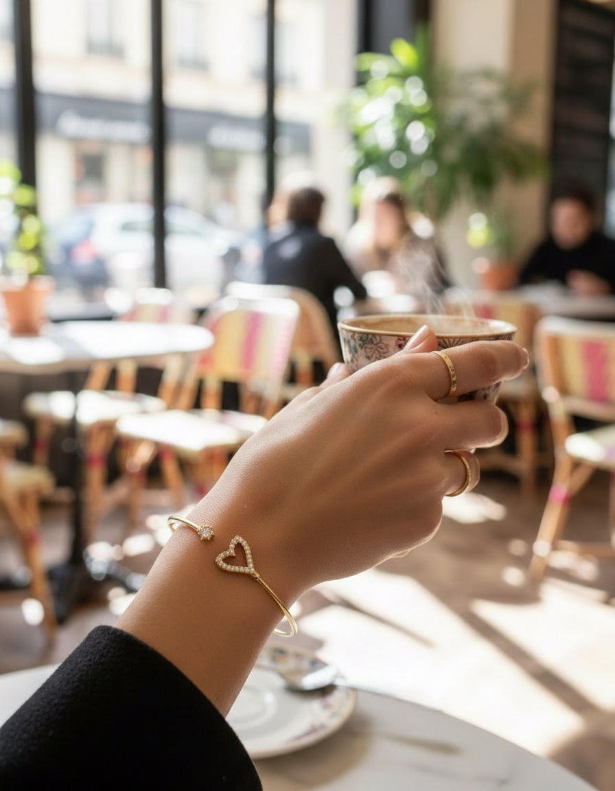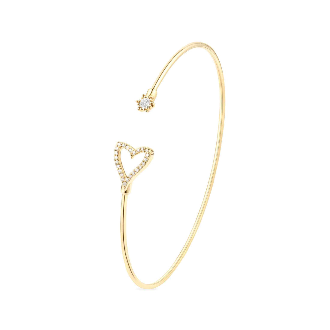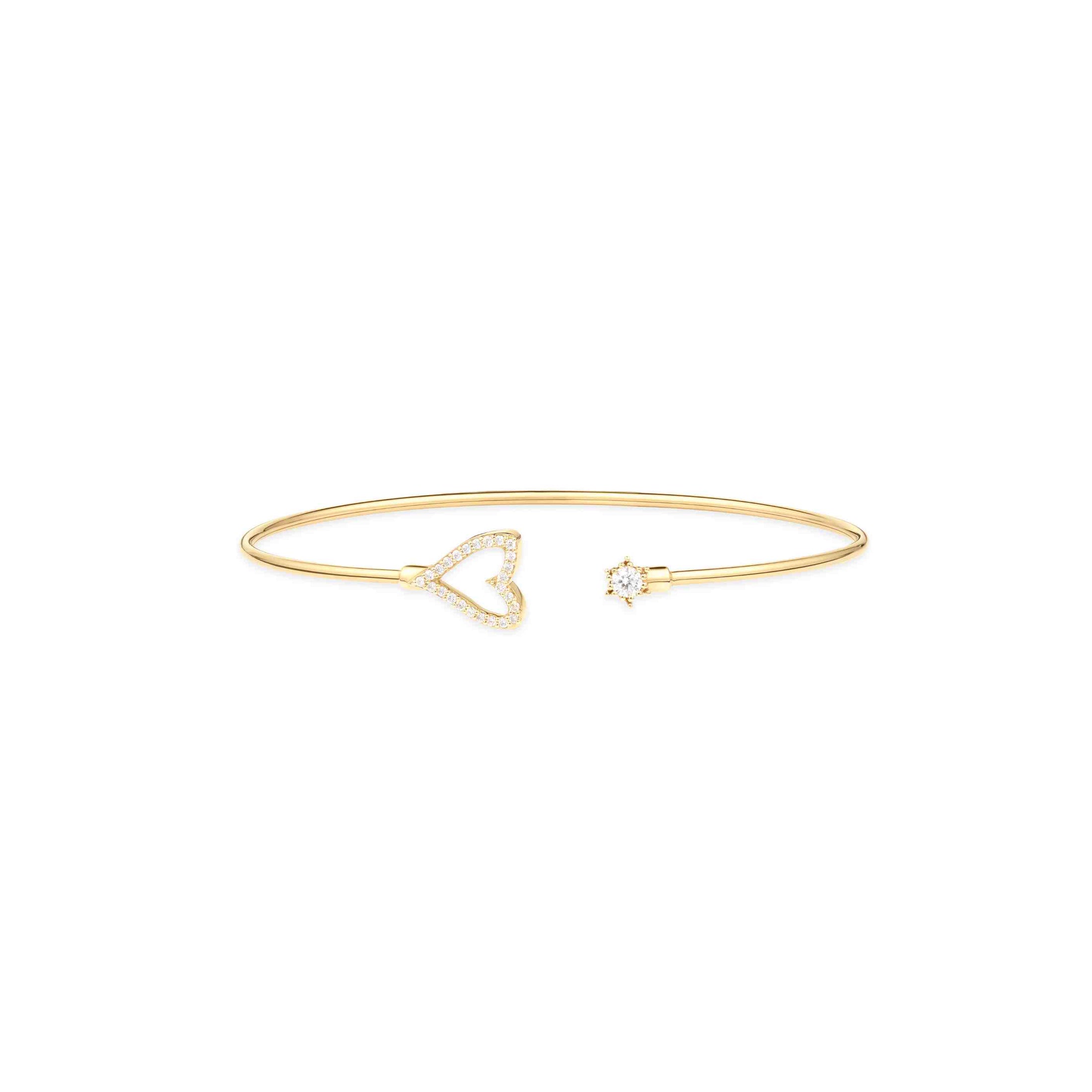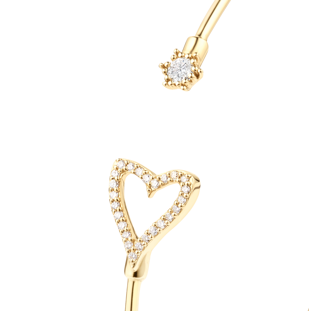 Épuré et délicatement sculptural, le jonc Corazón dessine un geste d’amour autour du poignet. Son cœur ouvert, subtilement pavé de diamants, semble flotter sur l’or, tandis qu’un diamant discret vient ponctuer l’extrémité du jonc — comme une étincelle de lumière.