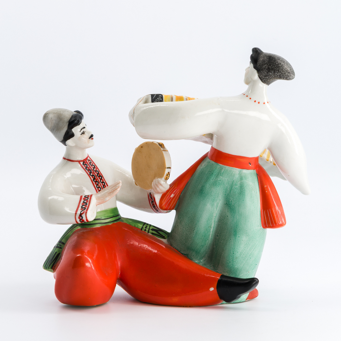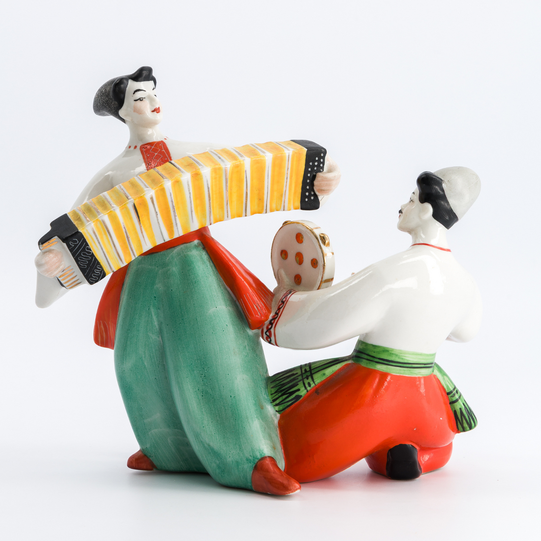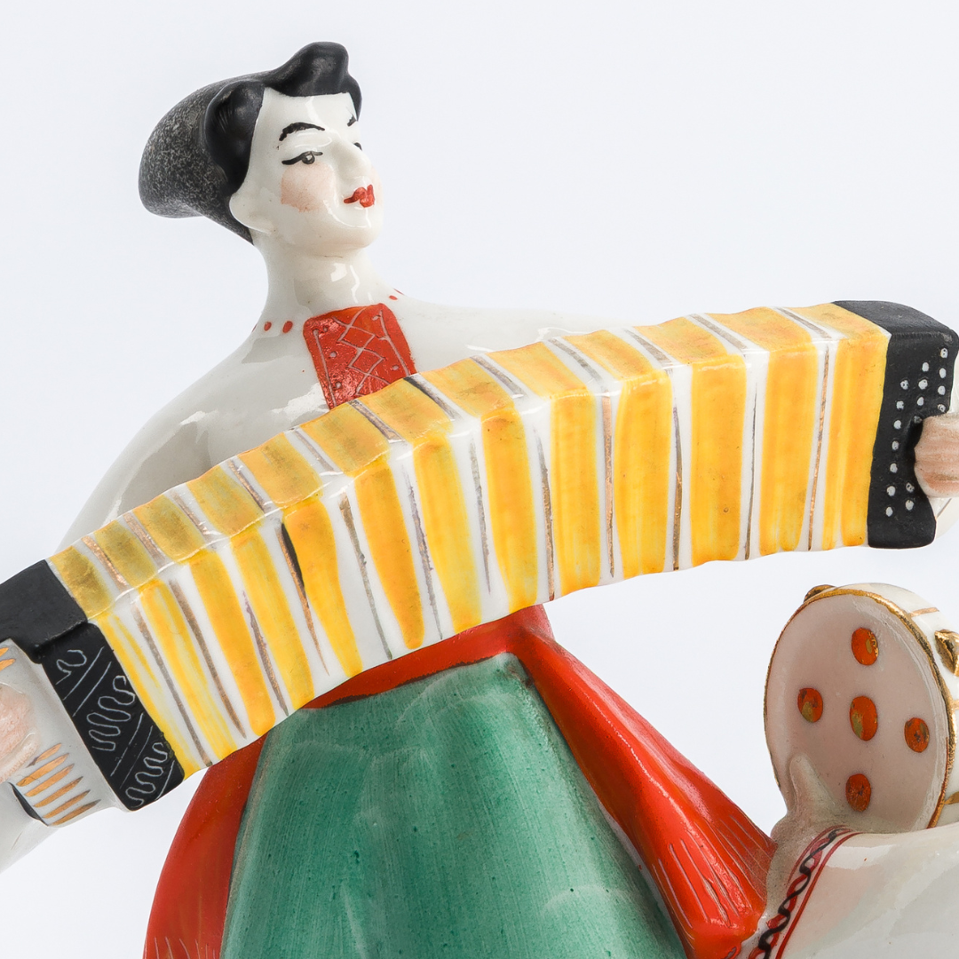 Cette pièce unique en porcelaine est une véritable célébration de la musique et du mouvement. Inspirée par l'esthétique joyeuse et stylisée de l’Art Déco, elle représente un duo de musiciens en pleine performance : l’un joue de l’accordéon, l’autre du tambourin. L’ensemble est riche en détails, des expressions animées aux costumes traditionnels colorés.