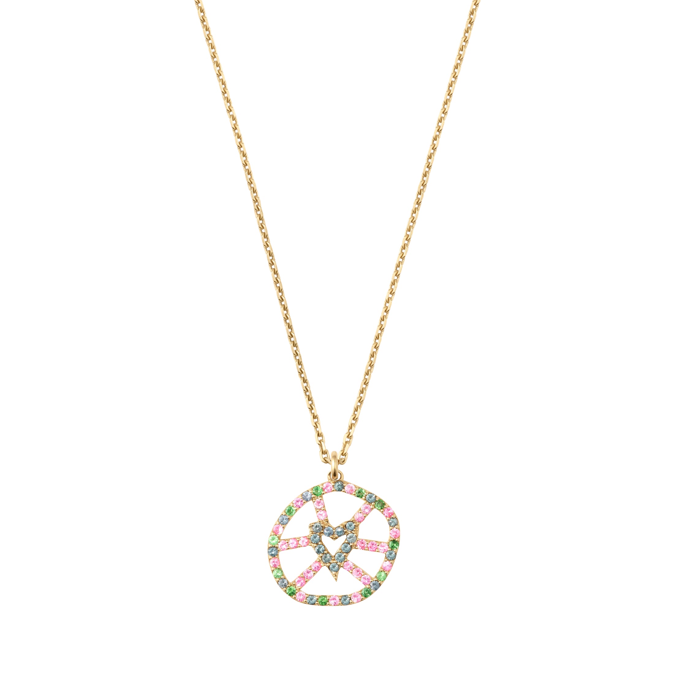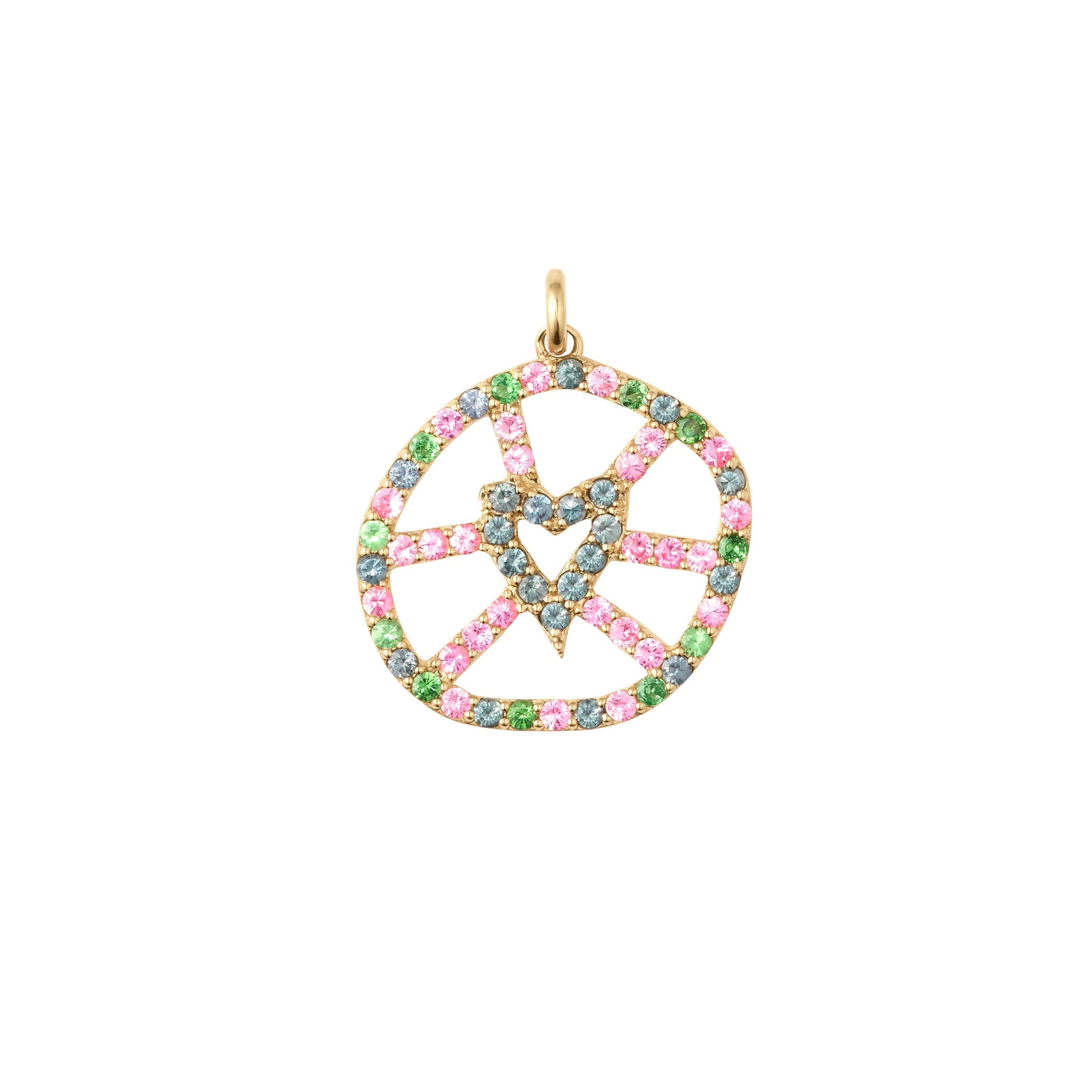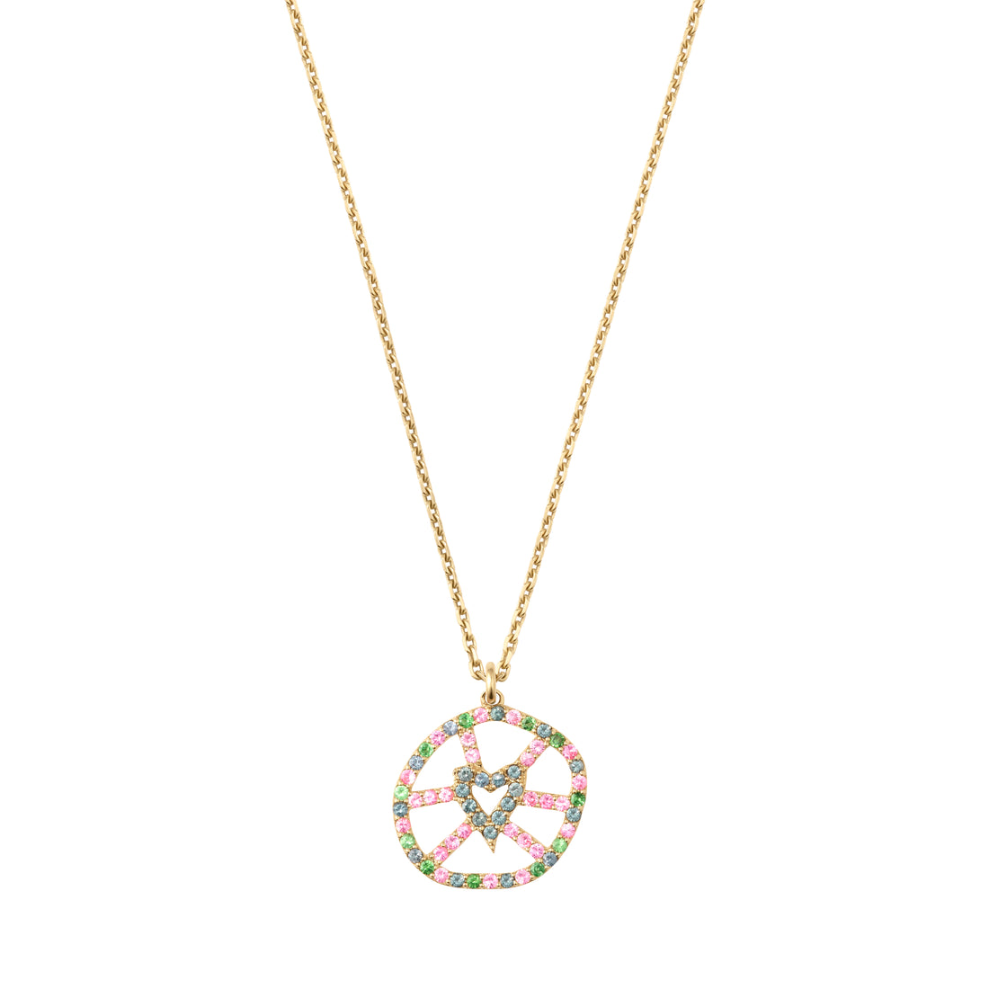 Le pendentif Corazón Irregular est en or recyclé, des spinelles et grenats en rose, gris et vert. Symbole du mantra de la Maison Spread Love Toujours, ce bijou artisanal incarne un geste d’amour sincère, un talisman à porter près du cœur. Sa taille est de 1,5 cm.