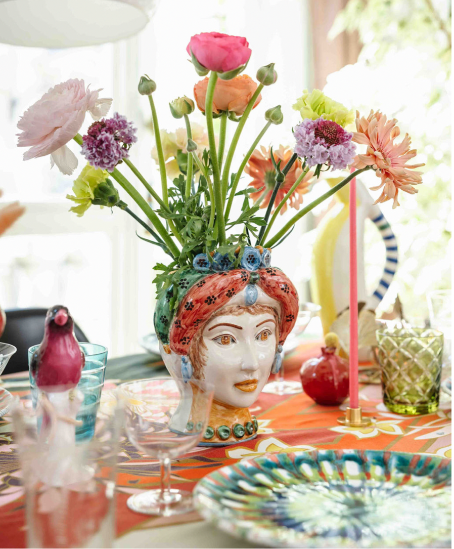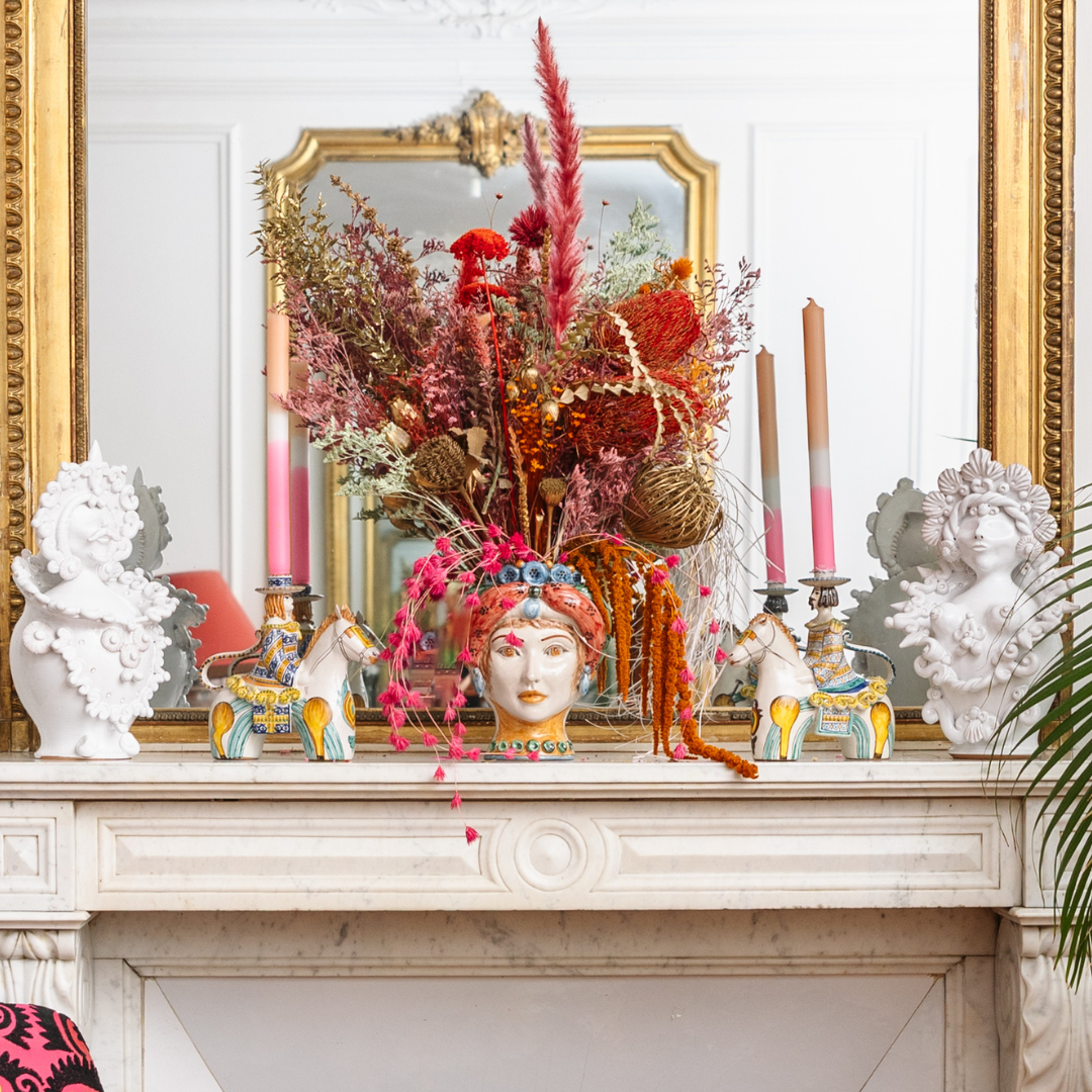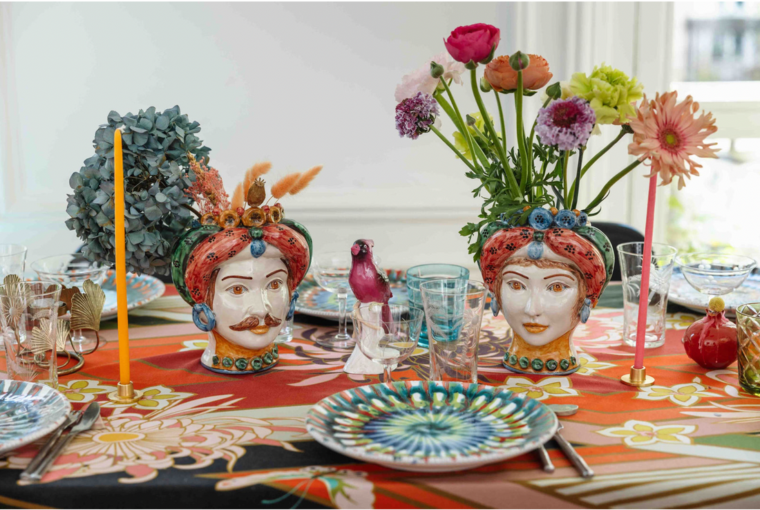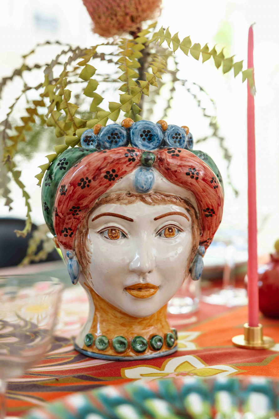 J’ai découvert ce vase lors d’un voyage en Sicile, à Caltagirone, le berceau de la céramique sicilienne. Dans une petite ruelle, baignée de lumière dorée, je suis tombée sur les plus belles Têtes de Maure de toute l’île. Mon amour pour ces figures emblématiques a commencé bien avant, dans les salles du musée d’anthropologie de Palerme, où elles racontaient leur histoire à travers les siècles. Poussée par la fascination, j’ai poursuivi ma quête jusqu’à rencontrer l’artisan Giuseppe Coffano. Un coup de cœur instantané pour son travail : une finesse inouïe, une élégance intemporelle.